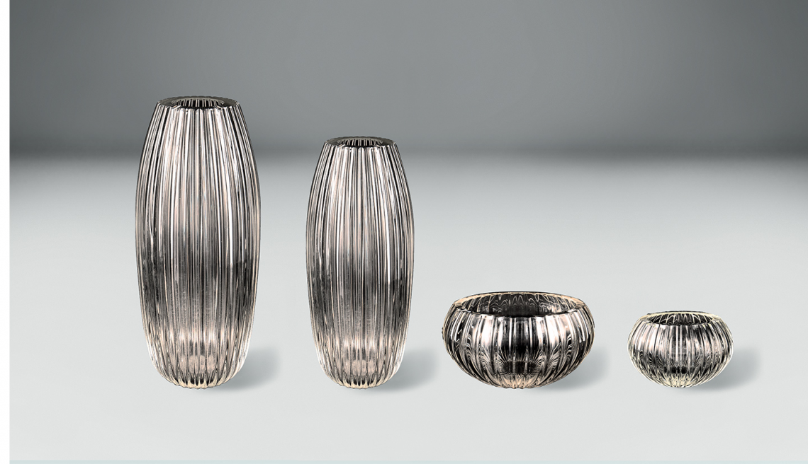 Completano questa ricerca tre diverse lavorazioni: battuto, a coste, le caratteristiche bolle e sfere specchiate.