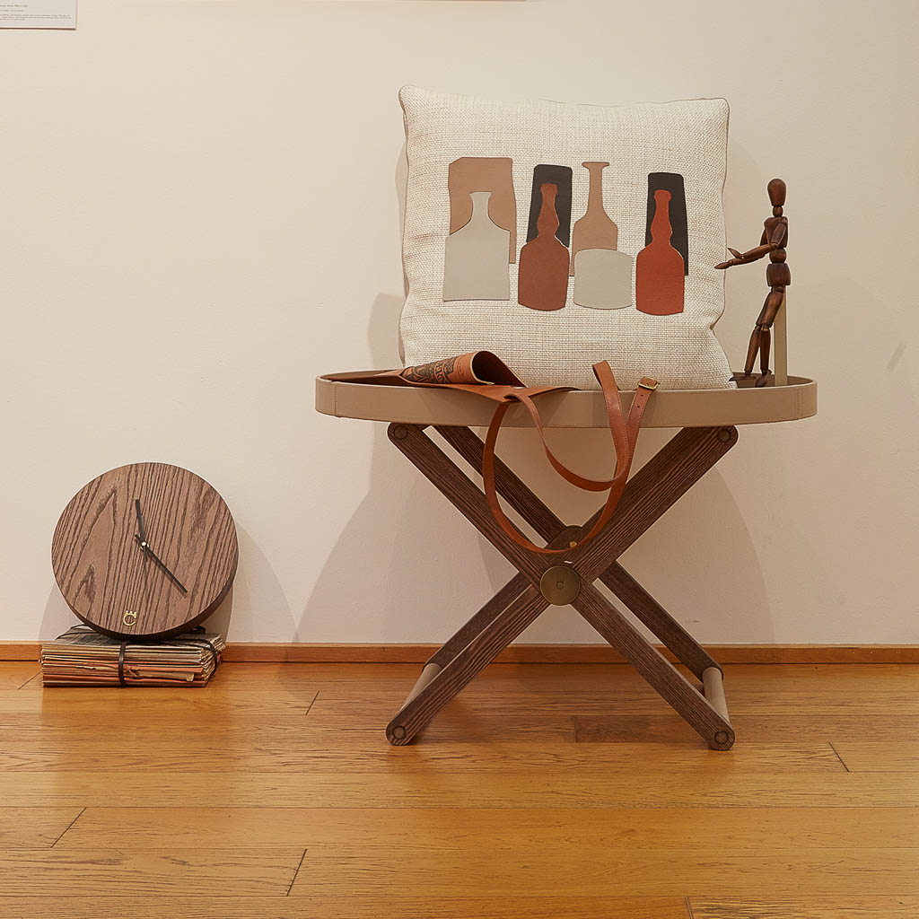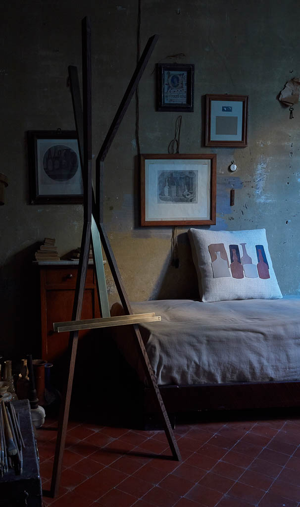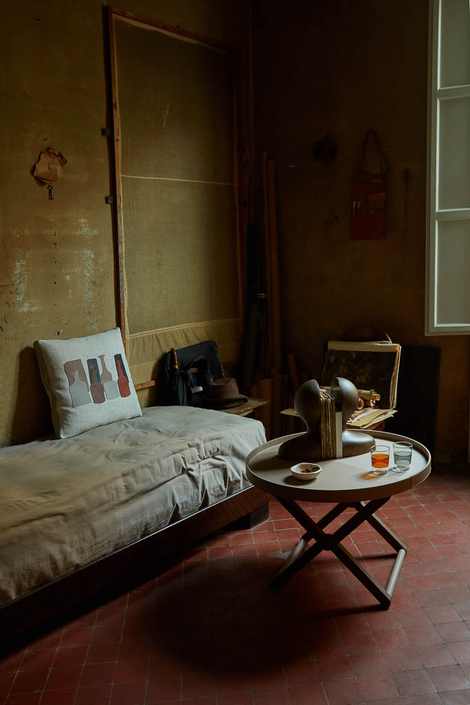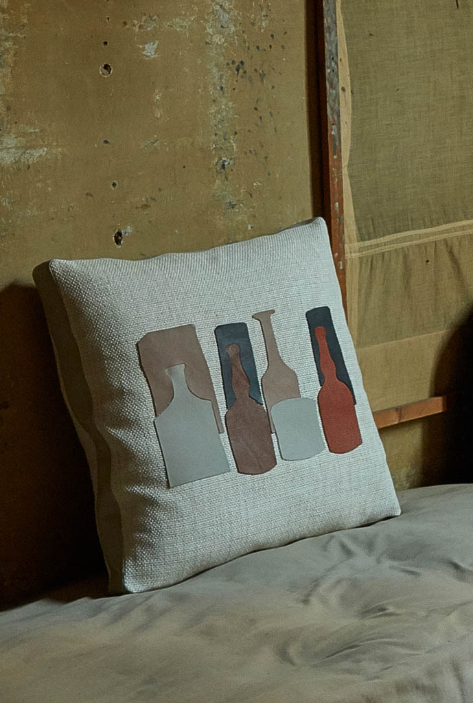 Cuscini in piuma d’oca, rivestiti in tessuto misto lino color Gog Avorio, impreziositi da sagome delle tipiche bottiglie del Maestro in pelle, fascia perimetrale rivestita in pelle color Sabbia.
