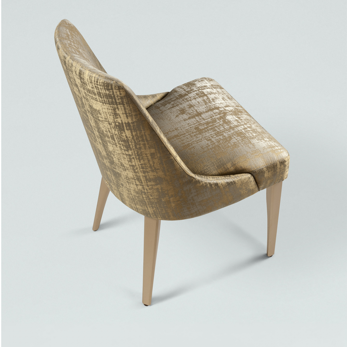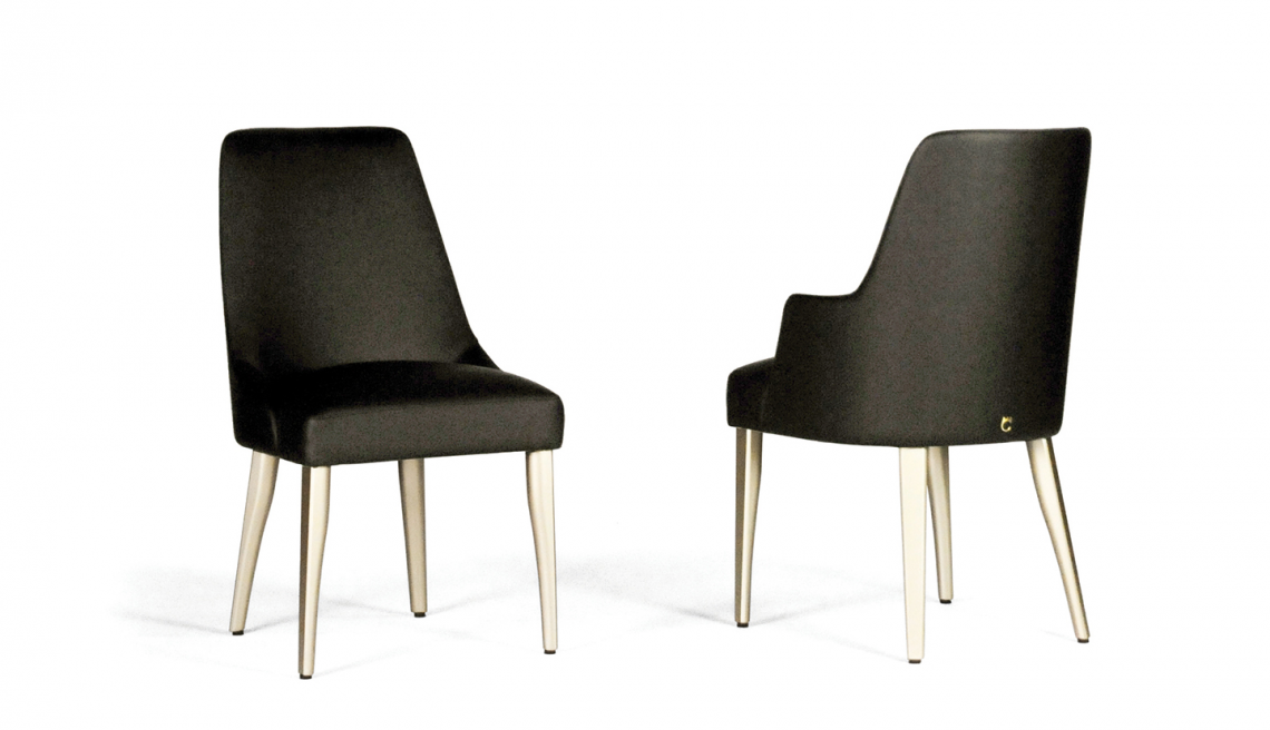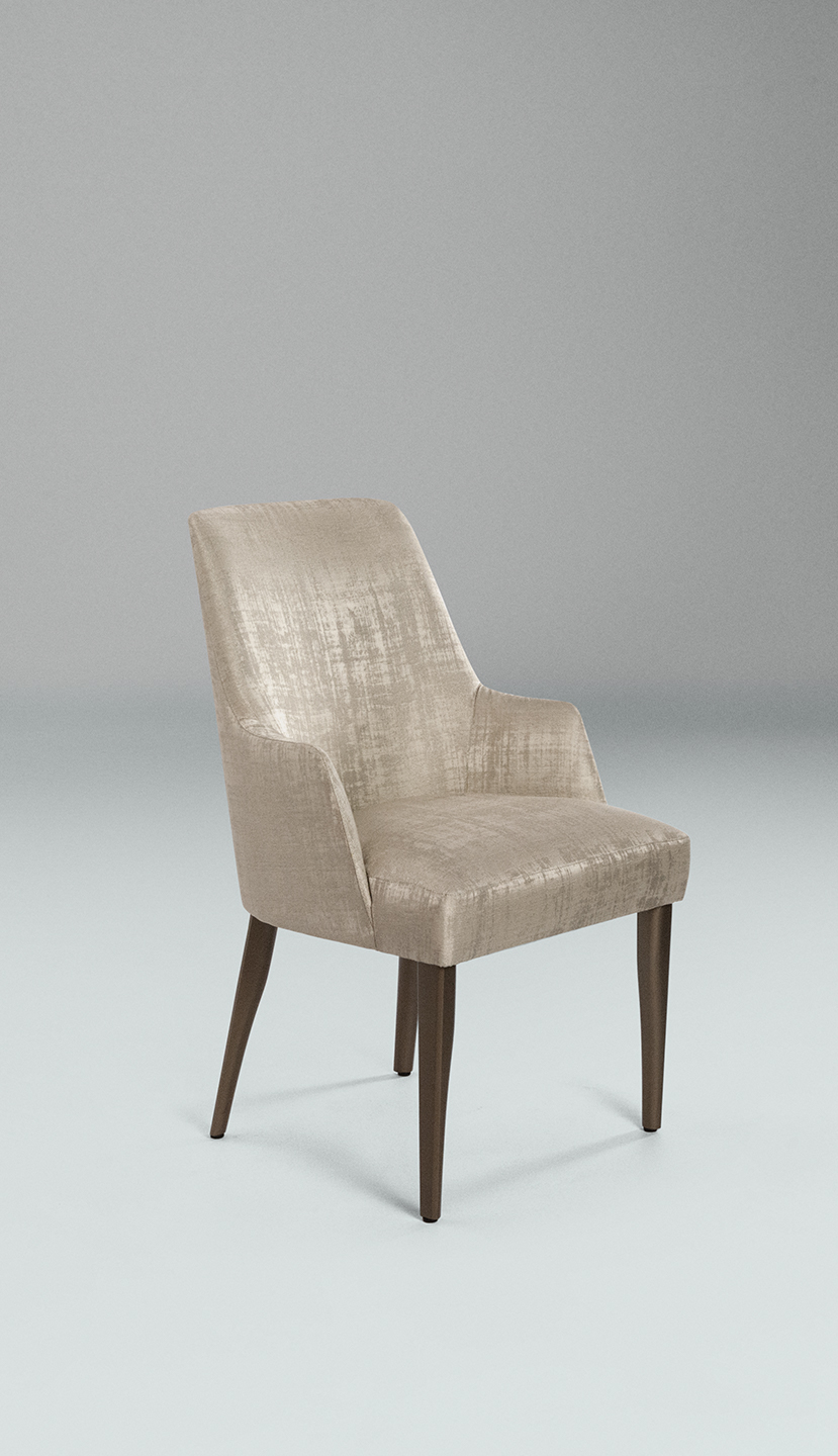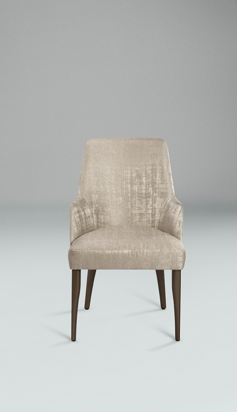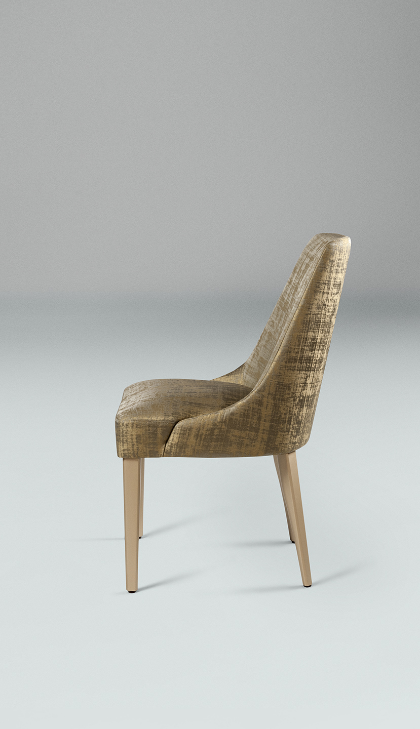 Il rivestimento è personalizzabile con eleganti tessuti, pelli bovine e nabuk, mentre le gambe sono in legno di faggio verniciato color oro opaco. Non sfoderabile. Audrey è disponibile nel modello con e senza braccioli.