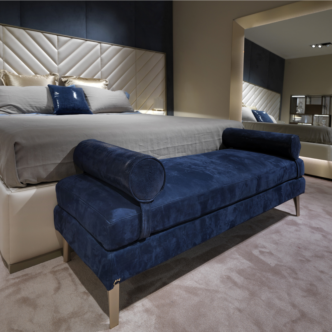 E’ decorato con cuscini cilindrici e i piedini sono in metallo con finitura oro opaco. E’ personalizzabile con pregiati tessuti, raffinati pelli bovine pieno fiore e nabuk.