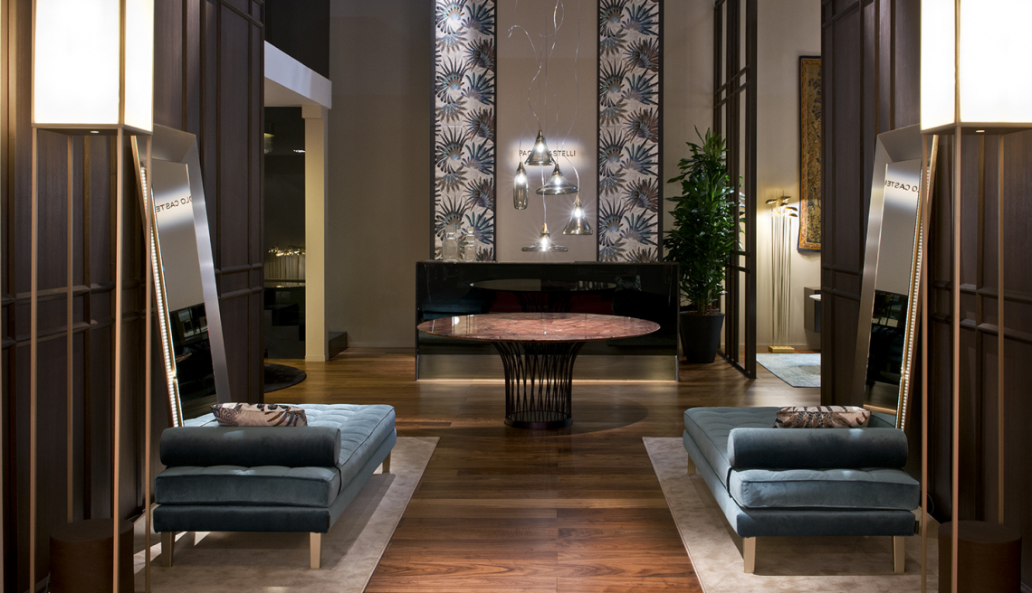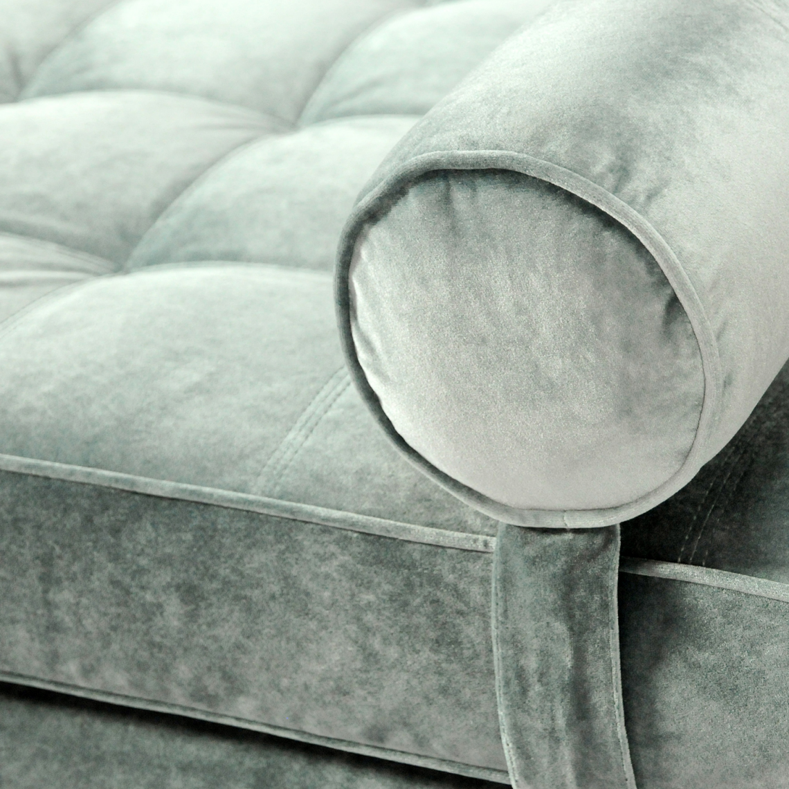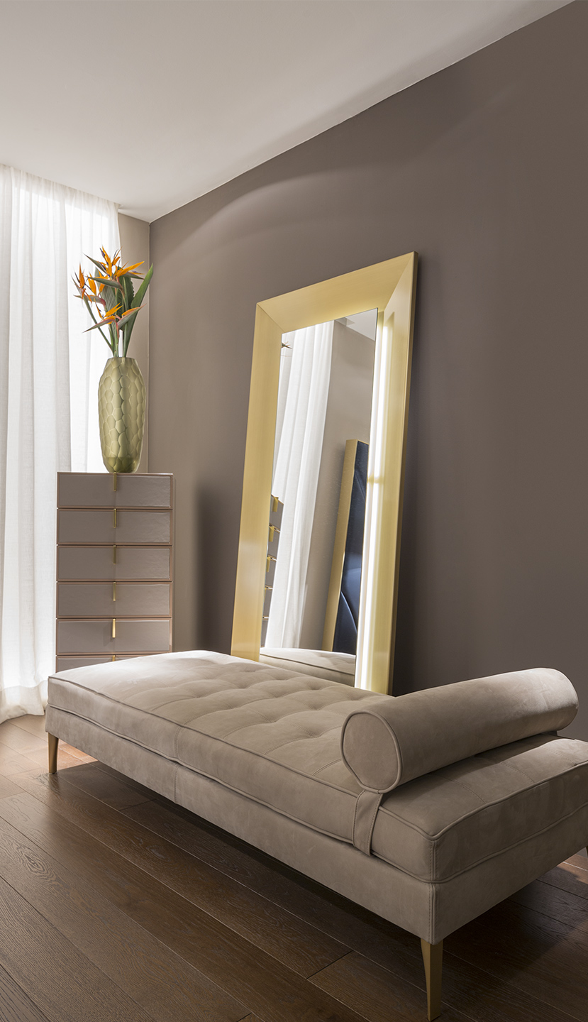 E’ decorato con cuscini cilindrici e i piedini sono in metallo con finitura oro opaco. E’ personalizzabile con pregiati tessuti, raffinati pelli bovine pieno fiore e nabuk.