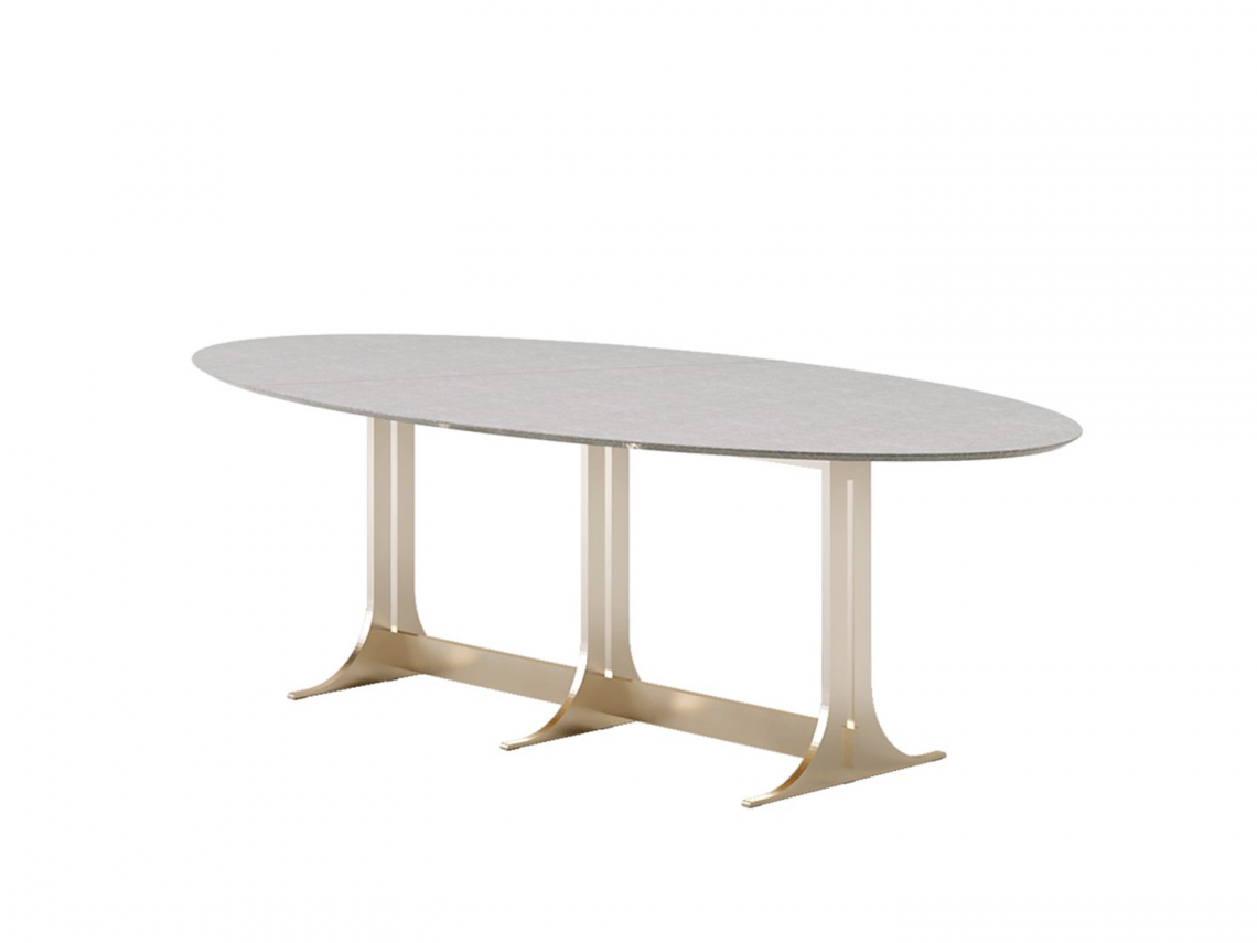 Tavolo da pranzo con struttura in metallo finitura color champagne a satinatura orbitale. Il top è realizzato in pietra di Vicenza sabbiata col. grigio o levigata col. avorio caratterizzata dalla presenza di macrofossili, arricchito da un inserto in profilo metallico color champagne opaco.