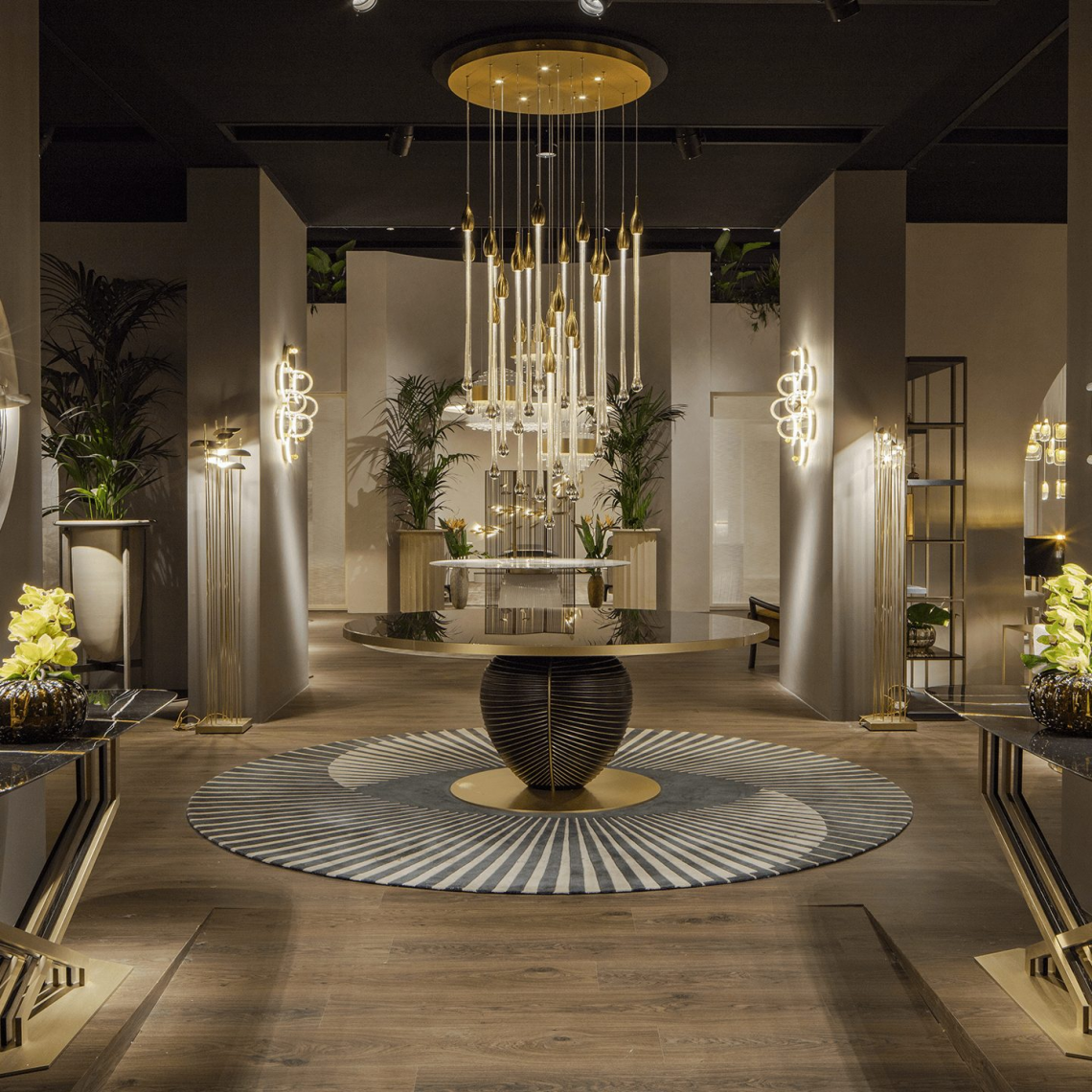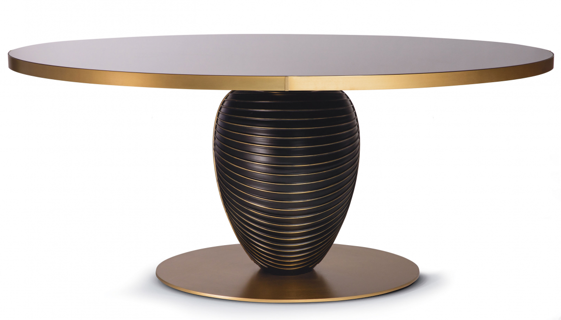 Un tavolo rotondo dalle dimensioni generose, caratterizzato da una base circolare in metallo, finitura oro satinato opaco, piedistallo decorativo in resina decorata a mano – finitura brunita, con dettagli in finitura oro opaco, top lucido in vetro retrolaccato RAL 8019 marrone grigiastro, con bordatura metallica finitura oro opaco.