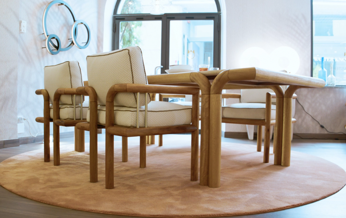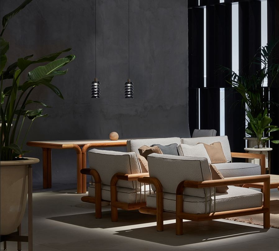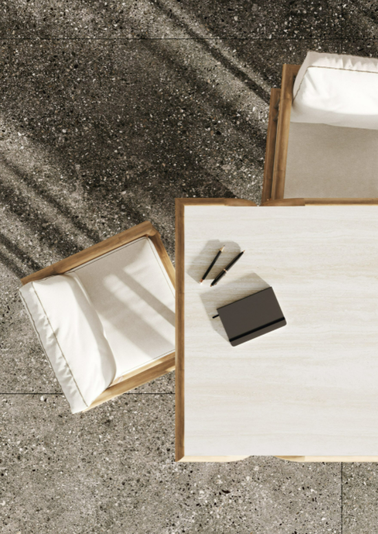 Legno massello di Iroko, spazzolato e tinto ad olio naturale, top in travertino naturale