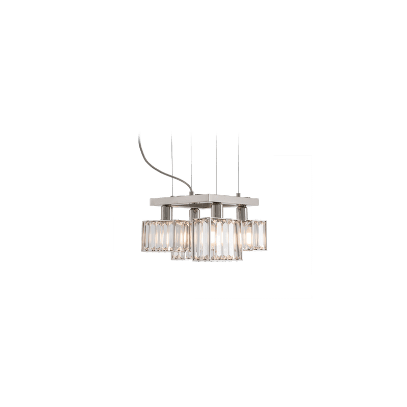 The peculiarity of the collection lies in the high number of possible combinations and the ease in creating new forms and dimensions due to the repetitions of the crystal module: an ensemble of parallelepipeds of various heights made of transparent crystal lozenges, hand-assembled over a metallic chassis.