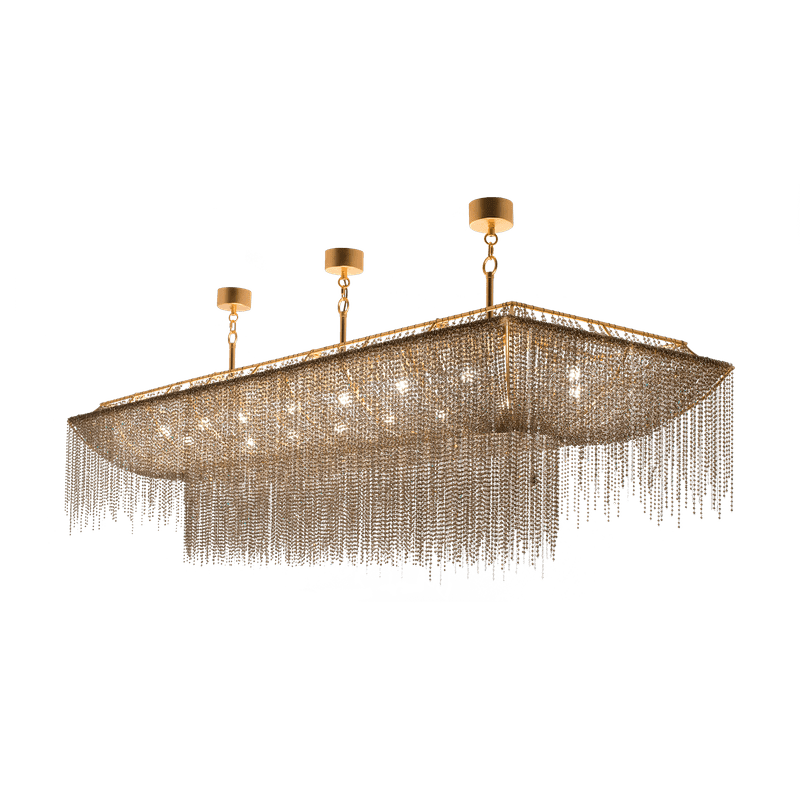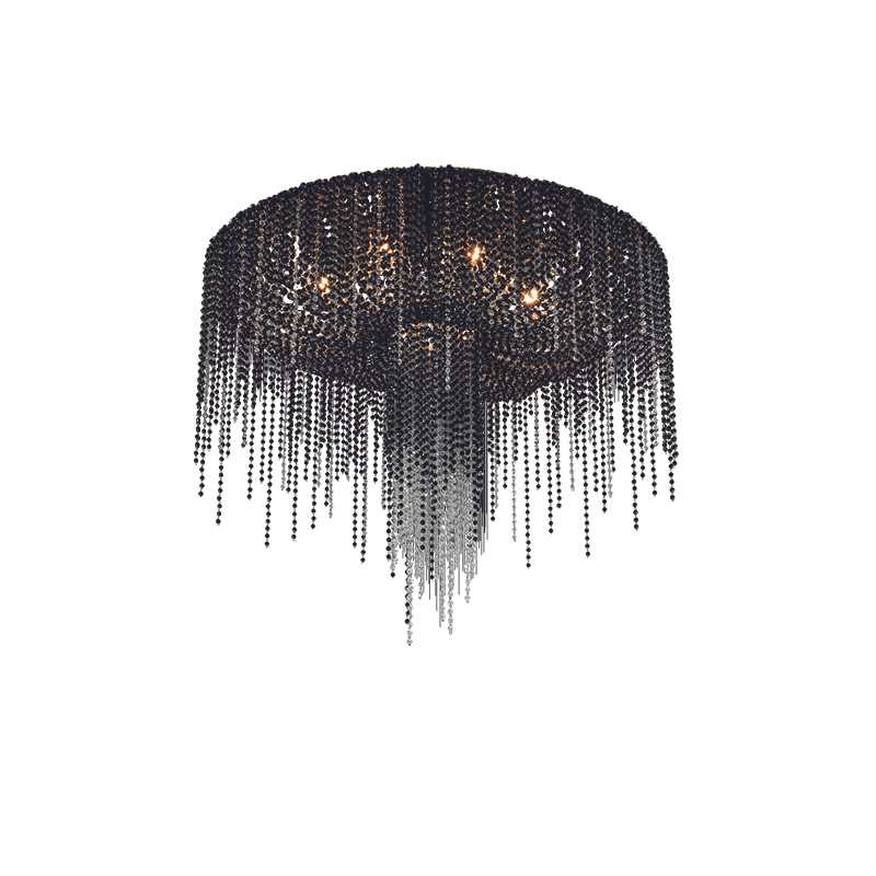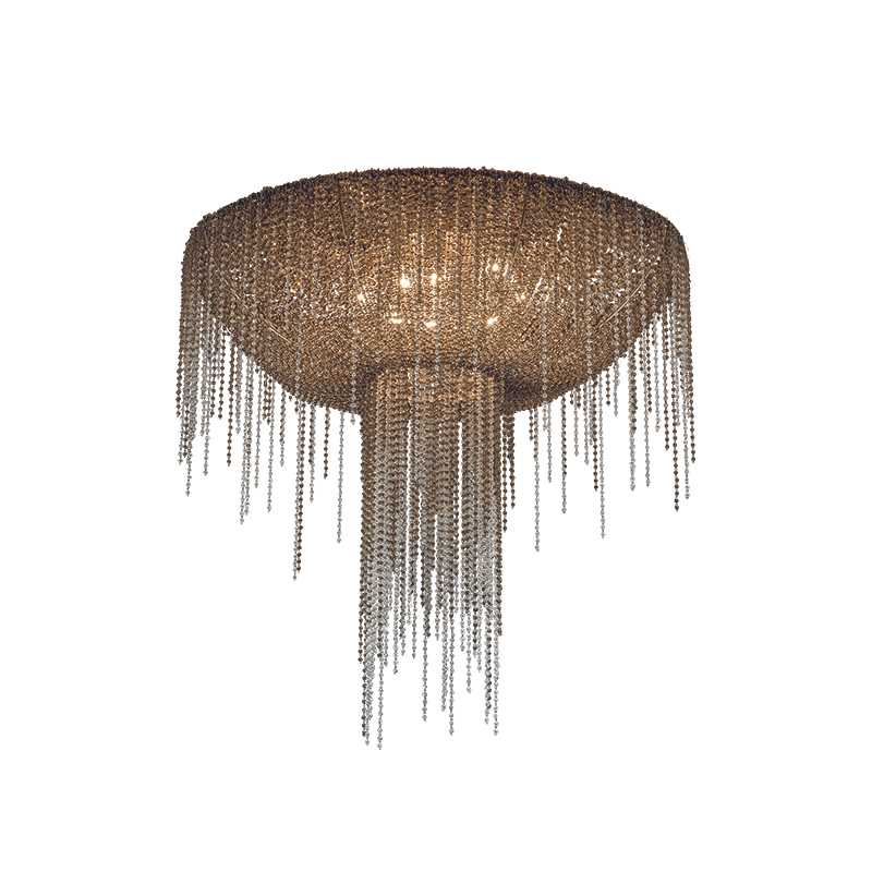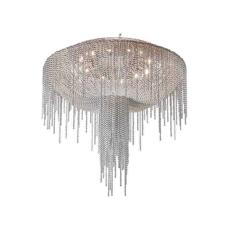 A drapery, some feathers, some precious gems: this is what comes to mind with Burlesque, a family of chandeliers with a strong personality. The protagonists here are the pearls with that multitude of precious strings that, just like a veil, lie down over the metallic structure of the lampshade, making it almost invisible. A collection capable of expressing a certain idea of femininity: mysterious, intense.