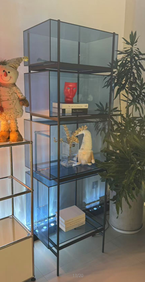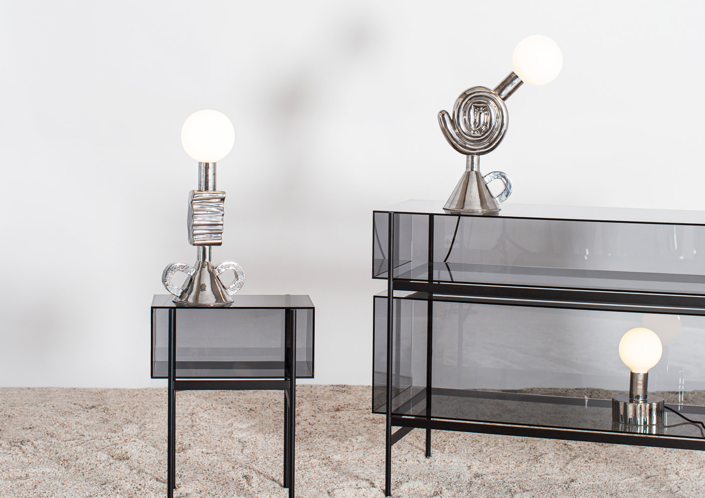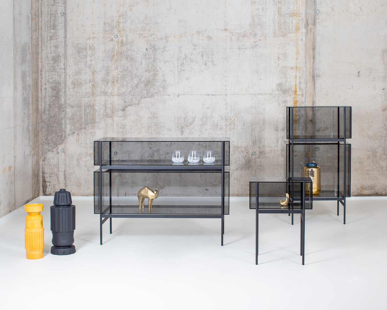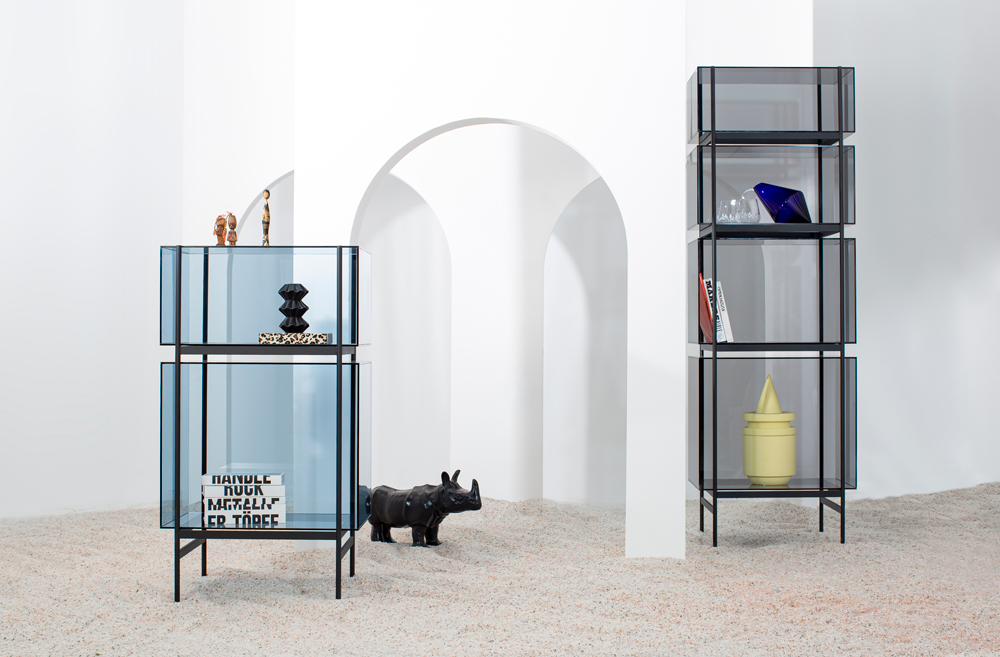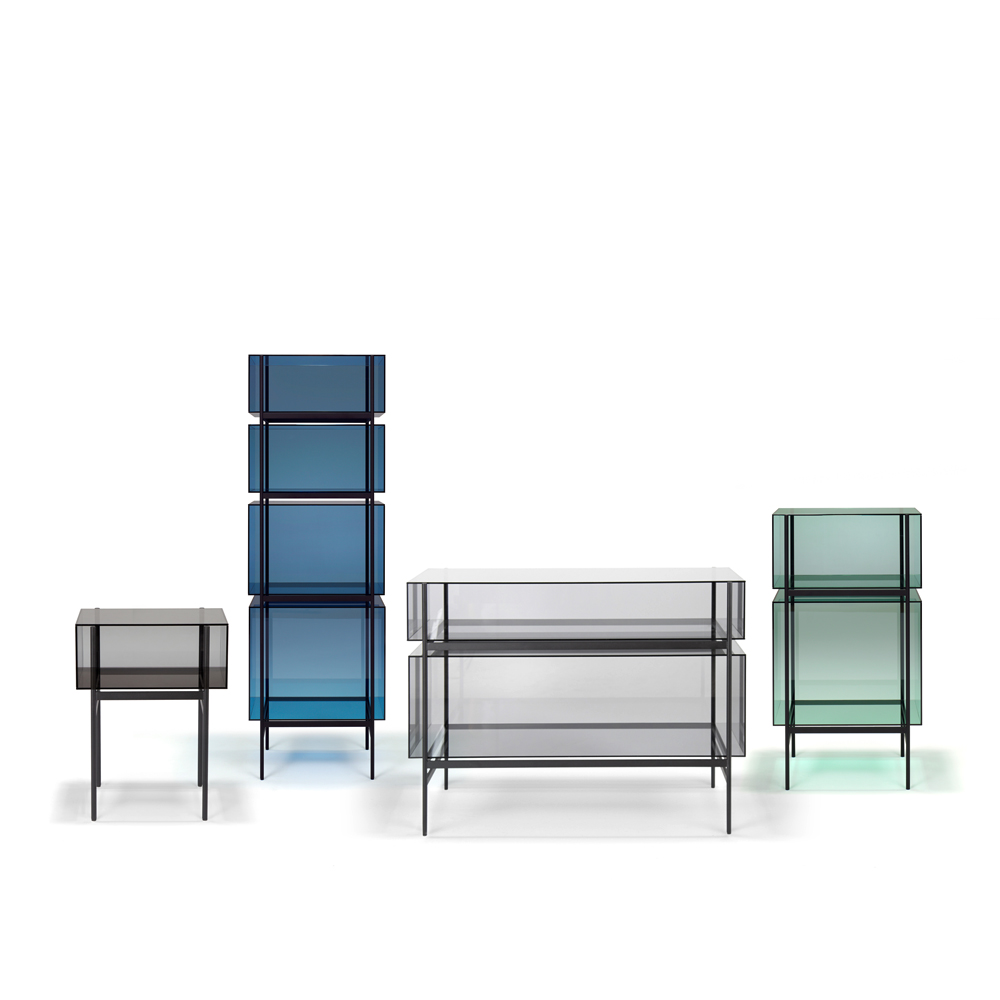 StudioVisser & Meijwaard describe their conception of lyn as a “graphic interplay between glass and the metal frameworks”. The doorless and diverse series of cabinets and high boards are equivalent to the designers’ ambition to rethink established forms, like they did in their past as fashion designers. The reduction to the absolute essential form opens a free interplay of material and colour. Depending on the lighting conditions, the viewer’s perspective and arrangement it casts the utmost of diverse highlights.
