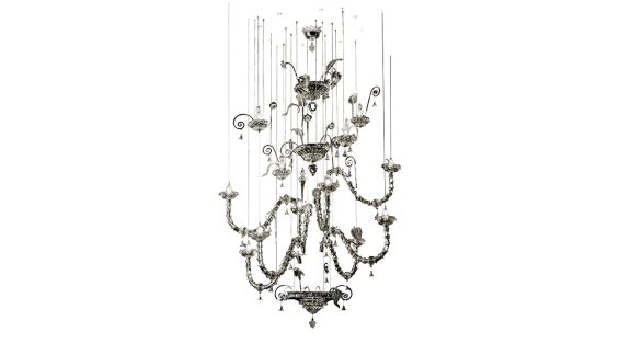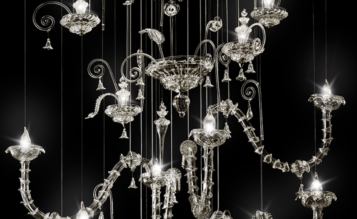 Lampadario in stile Ca' Rezzonico scomposto con led a rosone ed elementi pendenti illuminanti.