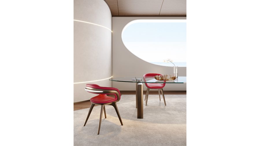 Sedia con scocca e gambe verniciate in bronze 100M, ottone 104M, ottone dark 105M o titanium 101M. Rivestimento interno in pelle o tessuto. Maniglia sul retro in acciaio lucido con logo pininfarina.
