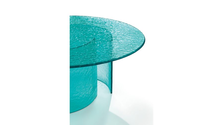 Tavolini con base e top in vetro Acqua nelle colorazioni fumè, trasparente, ambra, blu, smeraldo.