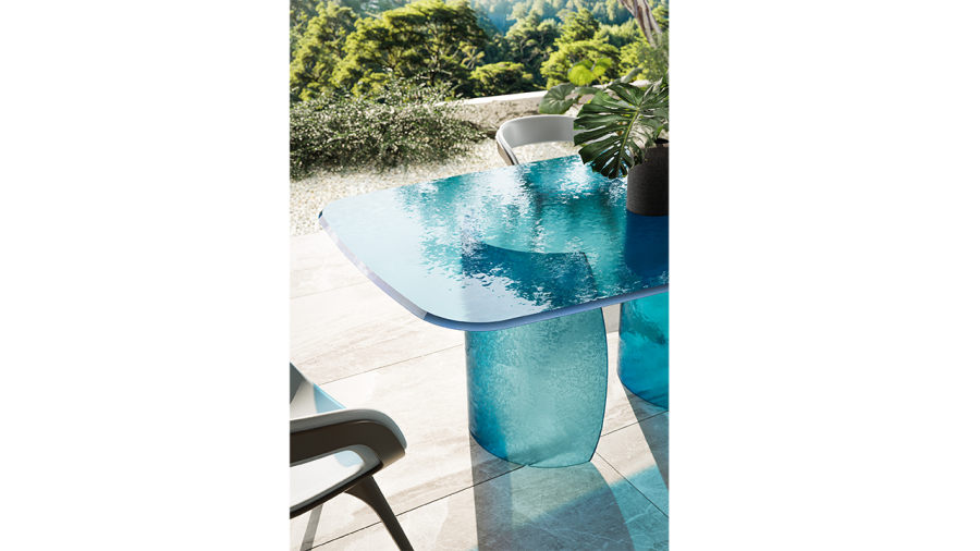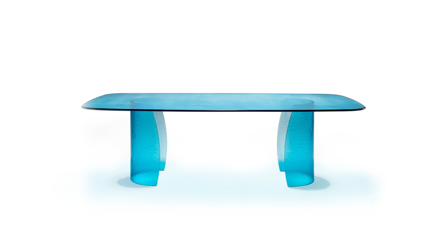 Tavolo da pranzo con base e top in vetro Acqua nelle colorazioni fumè, trasparente, ambra, blu, smeraldo.