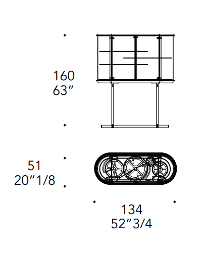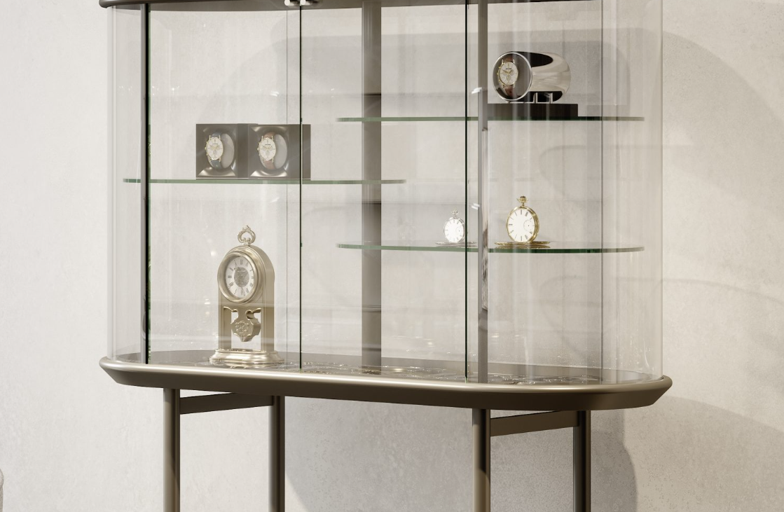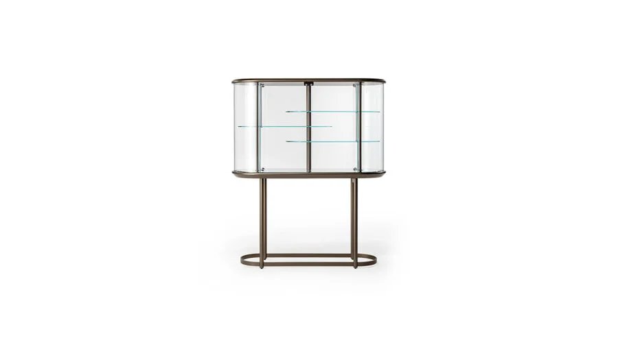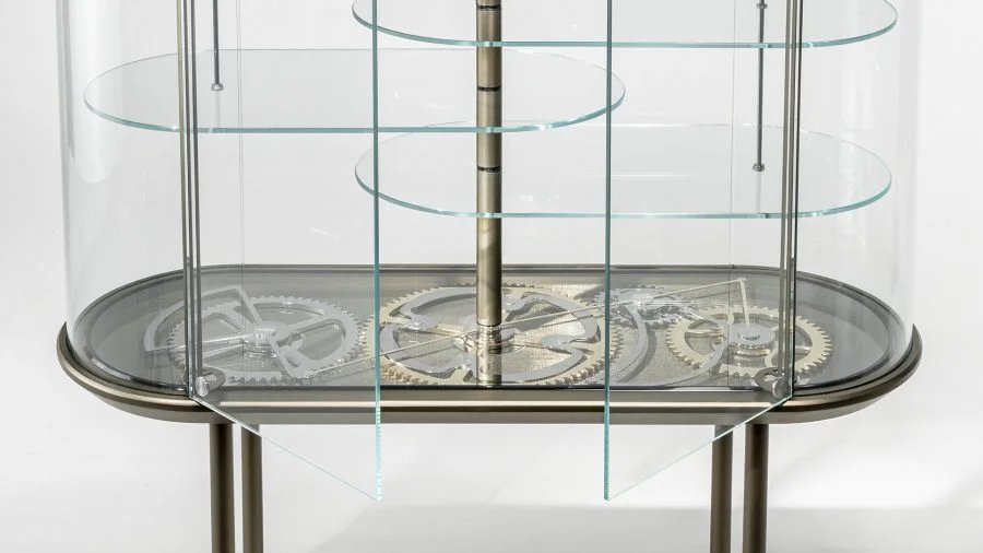 Bar con struttura e ripiani in vetro extrachiaro. Fondo,coperchio e basamento in finitura Bronze. Inserto top in MarmoReflex o LegnoReflex. Due ante con apertura sincronizzata tramite gli ingranaggi a vista in finitura oro e cromo lucido su fondale in vetro Mesh. Edizione numerata.