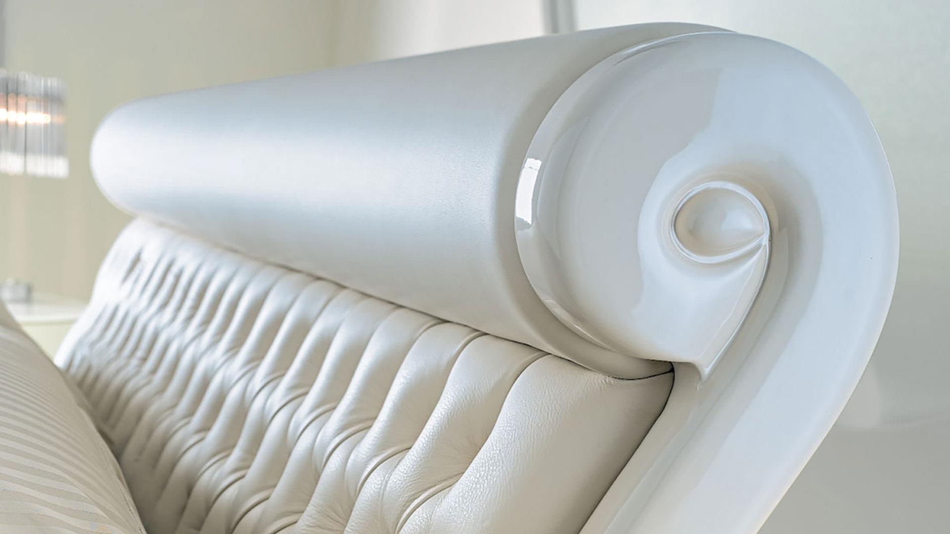Bed with head and footboards in lathed solid wood, cherrywood or shiny lacquered finish.
