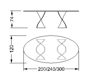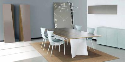 Dining table with bases in curved glass, extraclear, bronze, or smoke-grey with sandblasted finish.Available also in sandblasted and lacquered glass.Top available in transparent glass, Marble-glass or in Bevel Wood.
