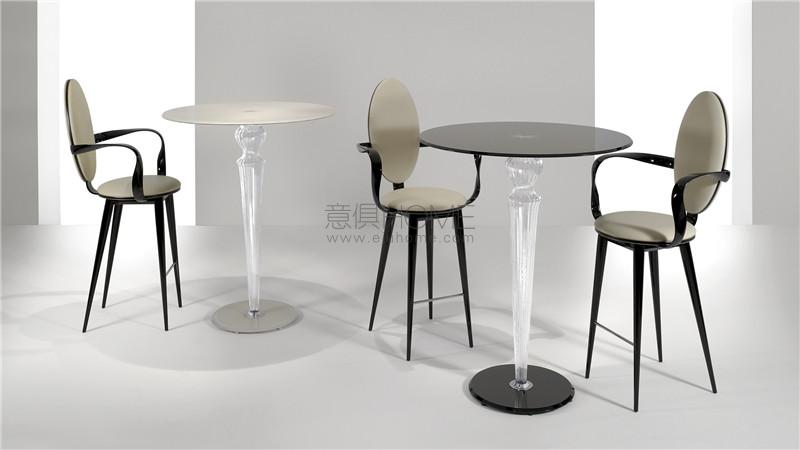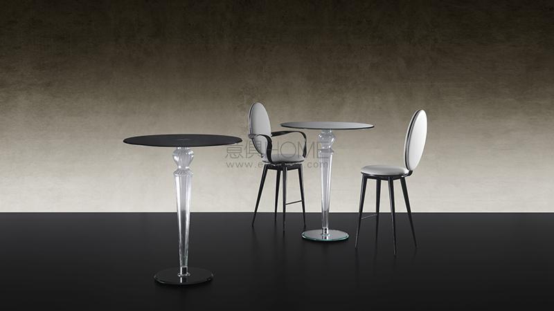 Bar table with leg in Murano glass smooth in transparent or coloured finish or ribbed in transparent or gold finish. Fixing part in chromed aluminium on a transparent or mirror glass base. Top with bevel in transparent, mirror or black lacquered glass.