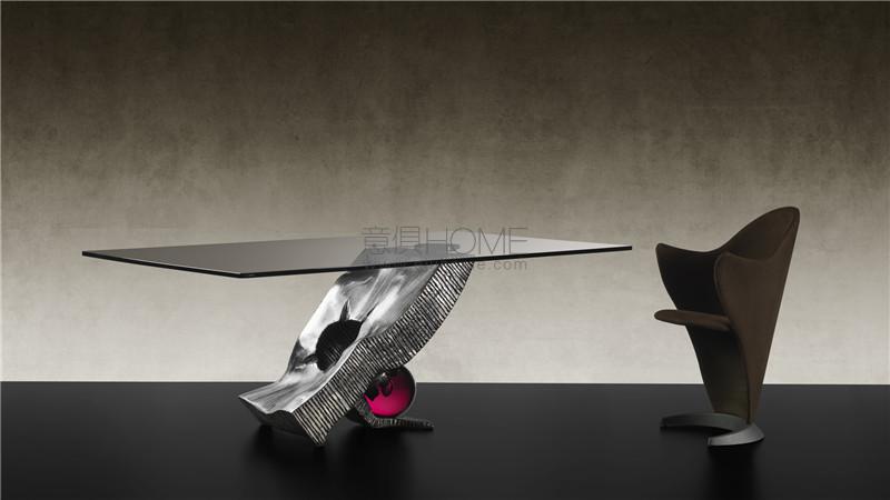 Dining table with base in varnished forged iron with Murano glass ball in blue, green or red.Top in transparent glass with polished edges.