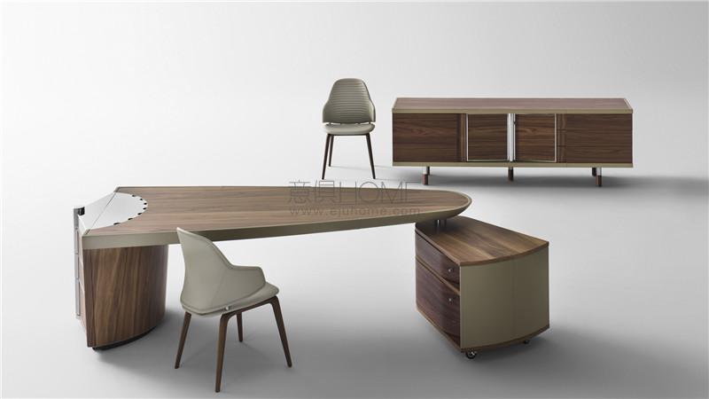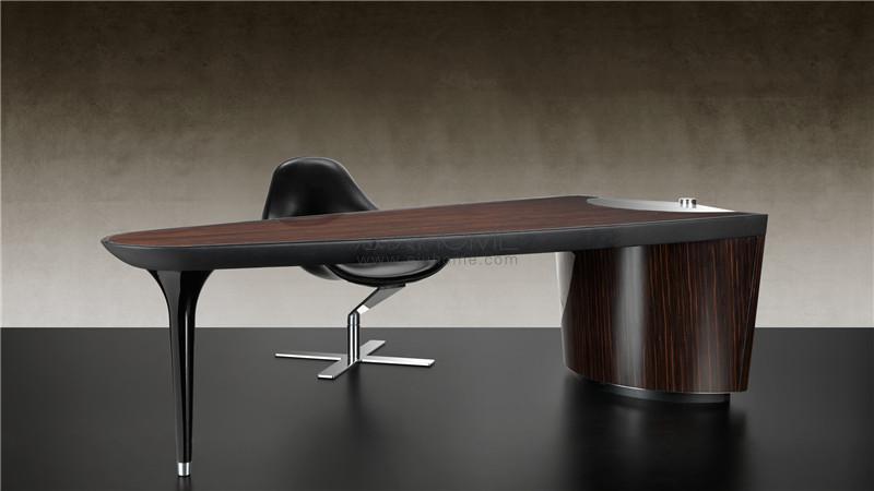 Desk with structure in Canaletto walnut or in shiny ebony wood and top-edge covered in leather. Top available in Canaletto walnut, shiny ebony wood, etched lacquered glass in various colours, Marble glass or in marble. Equipped with compartment for plugs and connections and unit with drawer and filing-drawer with edges and details in steel. Available with leg in black or pearl-grey Murano glass (A model), with swivel drawer’s unit (B model) or with arrangement to connect to ARK buffet (C model).