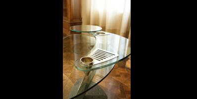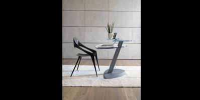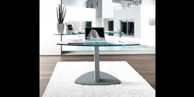 Desk with shaped tops in tempered 15 mm thick glass. Base and support in aluminium painted metal. Optional available: round glass shelf for printer and metal PC-tower support.
