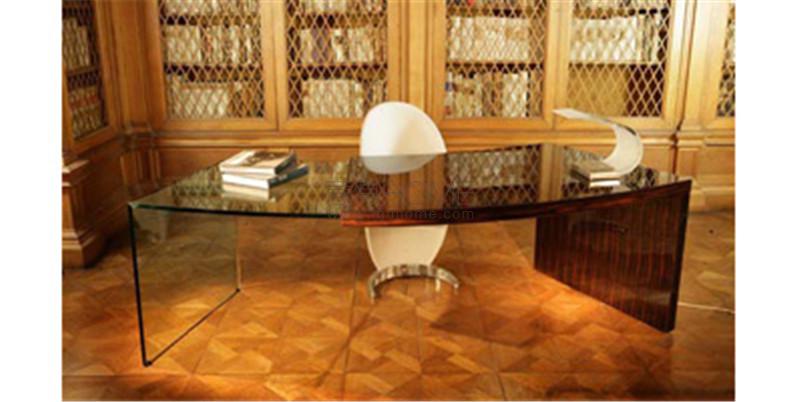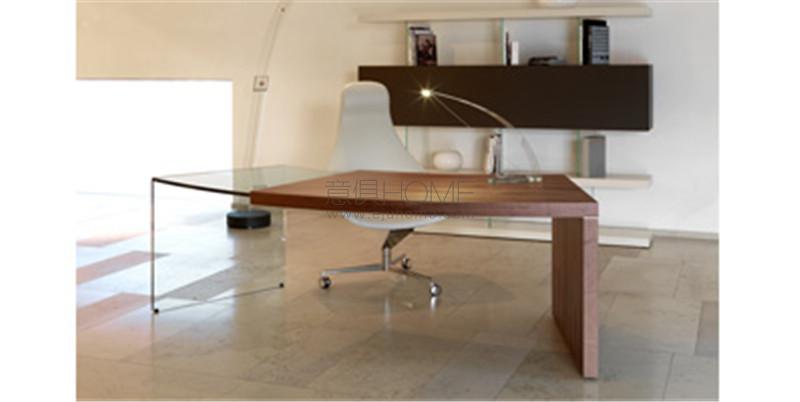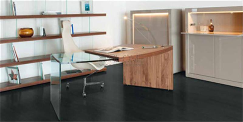 Desk with extensible wooden top and glass side 19 mm thick. Finishing: Canaletto walnut, shiny ebony, matt lacquered