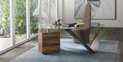 Desk with metal base in Grafite, satin brass or titanium finish or in scratchy steel finishing. Swivelling wooden unit with 3 drawers with shaped fronts in Canaletto walnut or in matt lacquered finish or with straight fronts covered in lacquered glass. Support in brushed steel. Shaped top in transparent tempered glass 15 mm thick with polished edges with cable hole or in Bevel Wood.