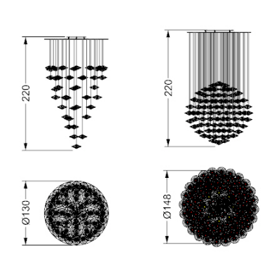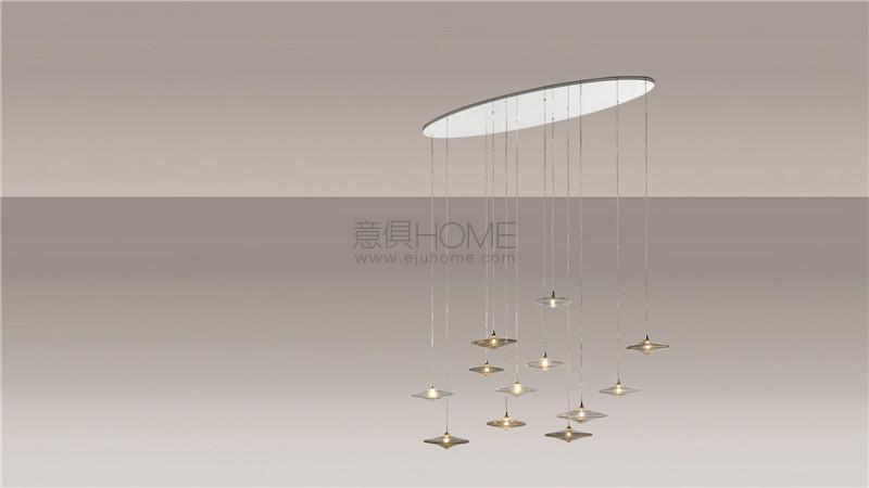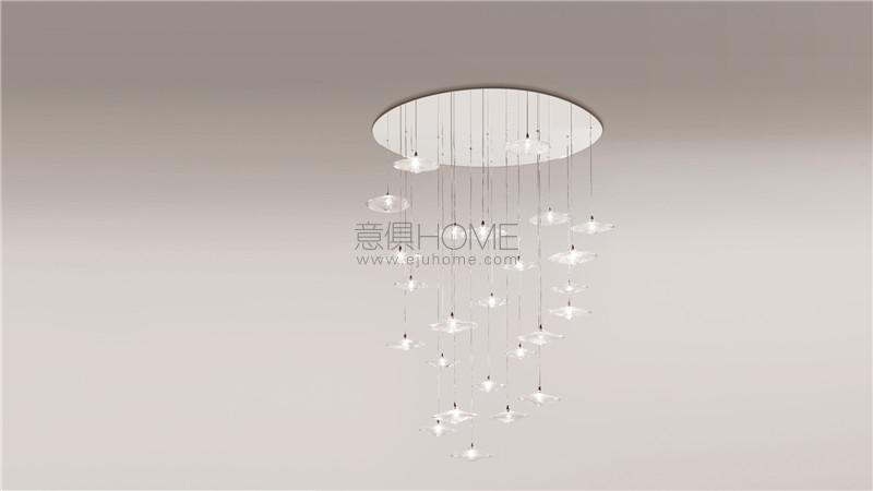 Chandelier with support in white or black lacquered or mirror glass and pendant elements in blown borosilicate glass, transparent or coloured with LED. It is possible to realize customized versions for dimensions, length and shape.