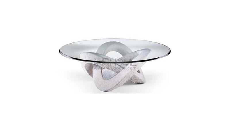 Coffee table with base in carved granitic material with bush-hammered finish. Glass top 12mm thick with 45° bevel.