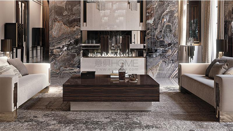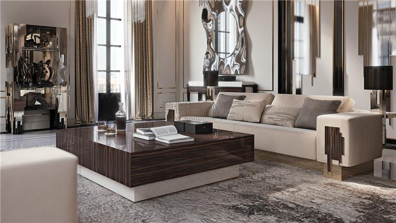 Coffee table with wooden top in shiny lacqured finish or shiny Ebony with gold serigraphy decorations. Plinth in satin brass finish.;