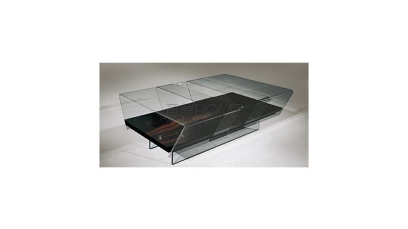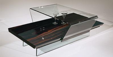 Sliding top in curved 10mm thick glass and glass legs 15 mm thick.