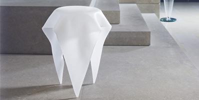Side tables in curved extraclear, bronze or smoke-grey glass with etched finish.