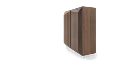Cupboard in wood with two doors. Available in: matt or shiny lacquered, satin brass or titanium finishing or in Canaletto walnut. Glass shelves inside. Legs in transparent glass or in brass or titanium finished metal.