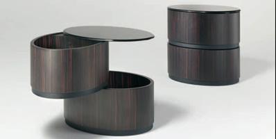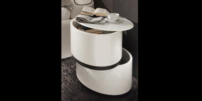 Nightstand with 2 drawers in curved wood in matt or shiny lacquered or in matt Ebony. Top in lacquered glass and leather cat.C details between the drawers. Also available in a leather cat.C, Nabuk, Colorata, Dune version, with top in lacquered glass in same colour. Details between the drawers in satin Brass (104M) or Titanium (101M) finish.