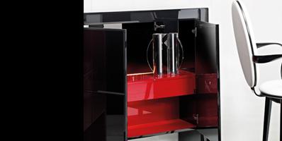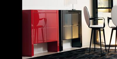 Cupboard in shiny lacquered finish with application of bevelled lacquered glass on the fronts. Internal drawer with lighting. Optional engravings and crystal handles on the doors.