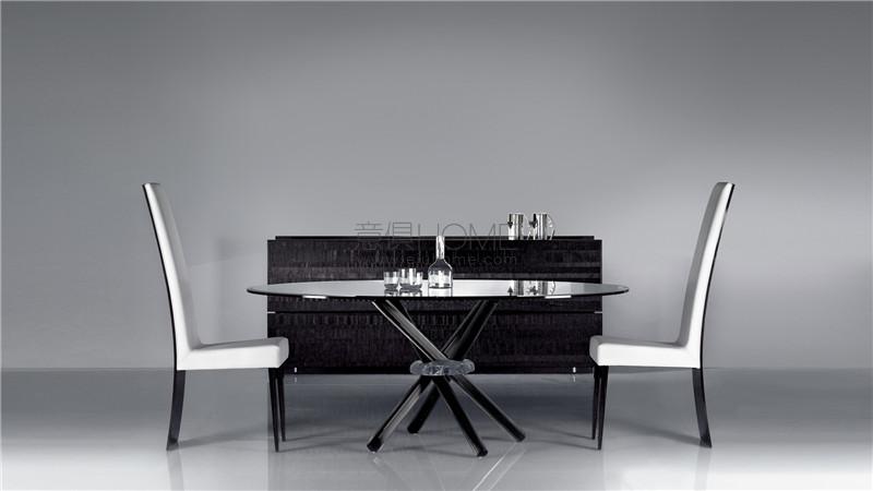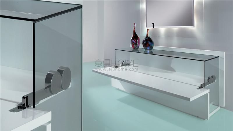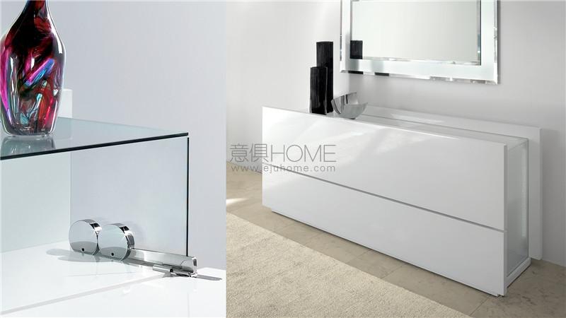 Buffet in wood available in Canaletto walnut, shiny ebony or shiny lacquered finish. 1 folding door and 1 drawer. Sides and top in transparent glass or in extra-clear, bronze or smoke glass with bush-hammered finish. LED lighting system