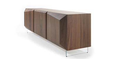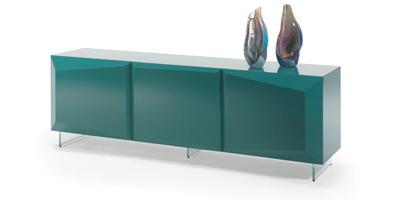 Sideboard in wood with two or three doors. Available in: matt or shiny lacquered, satin brass or titanium finishing or in Canaletto walnut. Glass shelves inside. Legs in transparent glass or in brass or titanium finished metal.