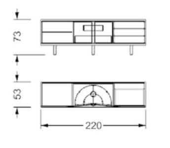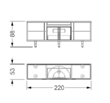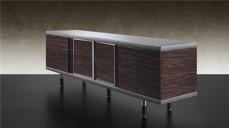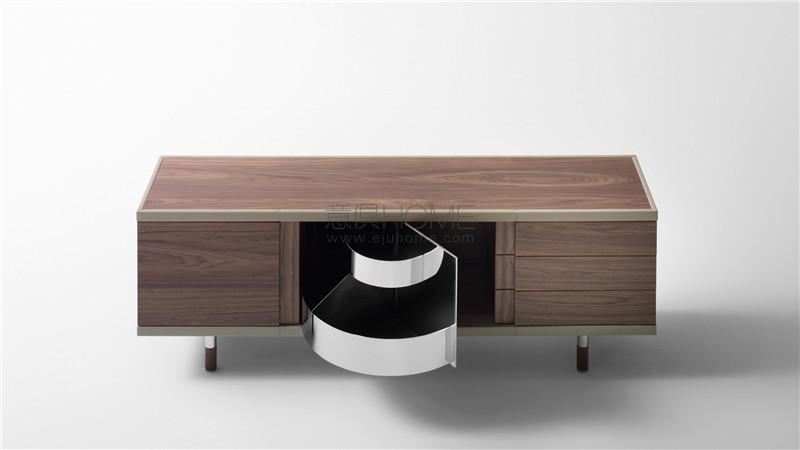 Structure in Canaletto walnut, oakwood Henné or in shiny ebony wood. Top available in Canaletto walnut, oakwood Henné, shiny ebony wood, etched lacquered glass, Mesh glass, marble-glass or in marble. Top and bottom edges covered in leather. Legs in steel and wood. Low version with one door with inner shelf, central unit with turning steel basket and right space with three drawers. (A model). High version with two doors with inner shelf, central unit with turning steel basket and one drawer (B model).