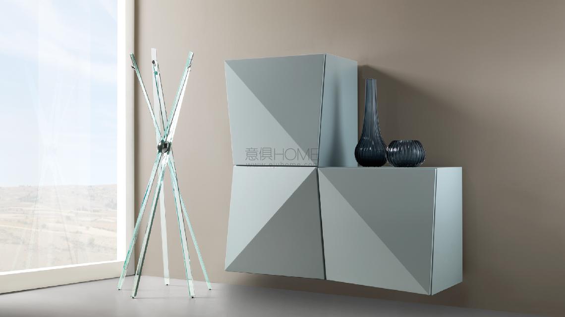 Modular storage unit in wood with left or right opening, available in matt or shiny lacquered finish, Canaletto walnut, silver or gold leaf or in satin brass or titanium finishing. It can be used to make compositions in various sizes and shapes, hanging or at the floor with glass legs and top.