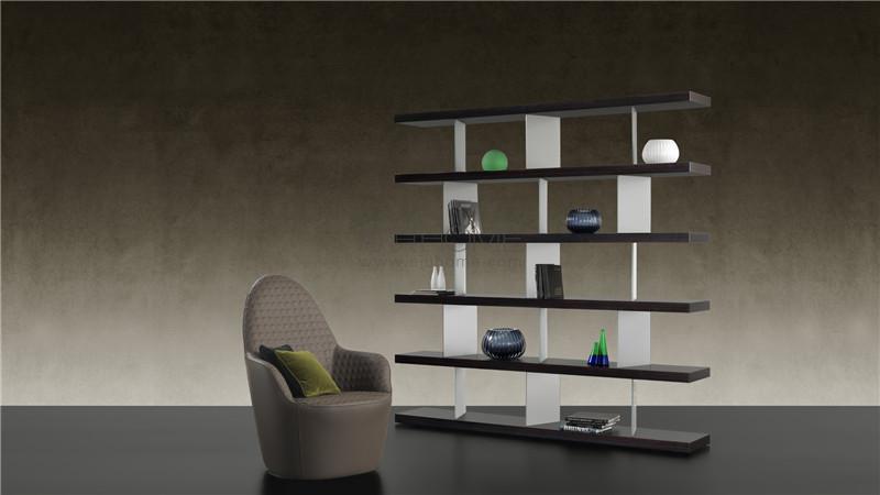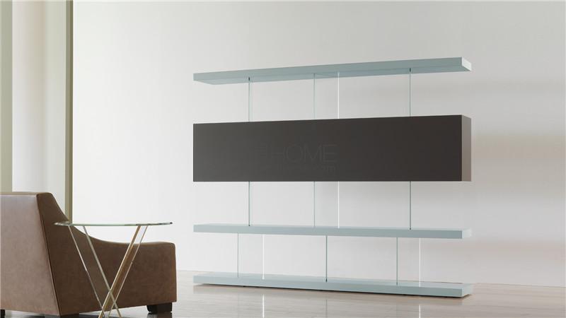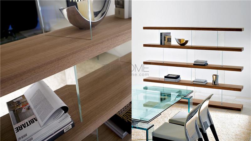 Interlocking modular bookcase with shelves in matt or shiny lacquered wood, Canaletto walnut or matt or shiny ebony wood. Sides in extraclear glass 10 mm thick. Optional: sliding door in lacquered or etched lacquered glass, in Mesh glass or in Marble glass.