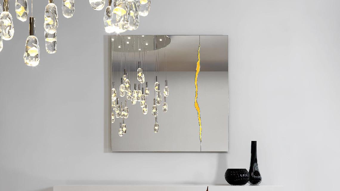 Mirror in extra clear 8mm thick glass with decoration in gold. Optional LED lighting.