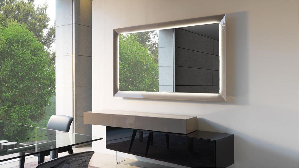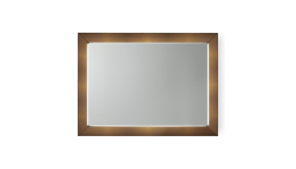Collection of mirrors, also as TV-mirror, with a glass frame available in: mirror, smoked-mirror, lacquered or etched lacquered finish, Mesh glass or in the new satin brass or titanium metallic finishes.