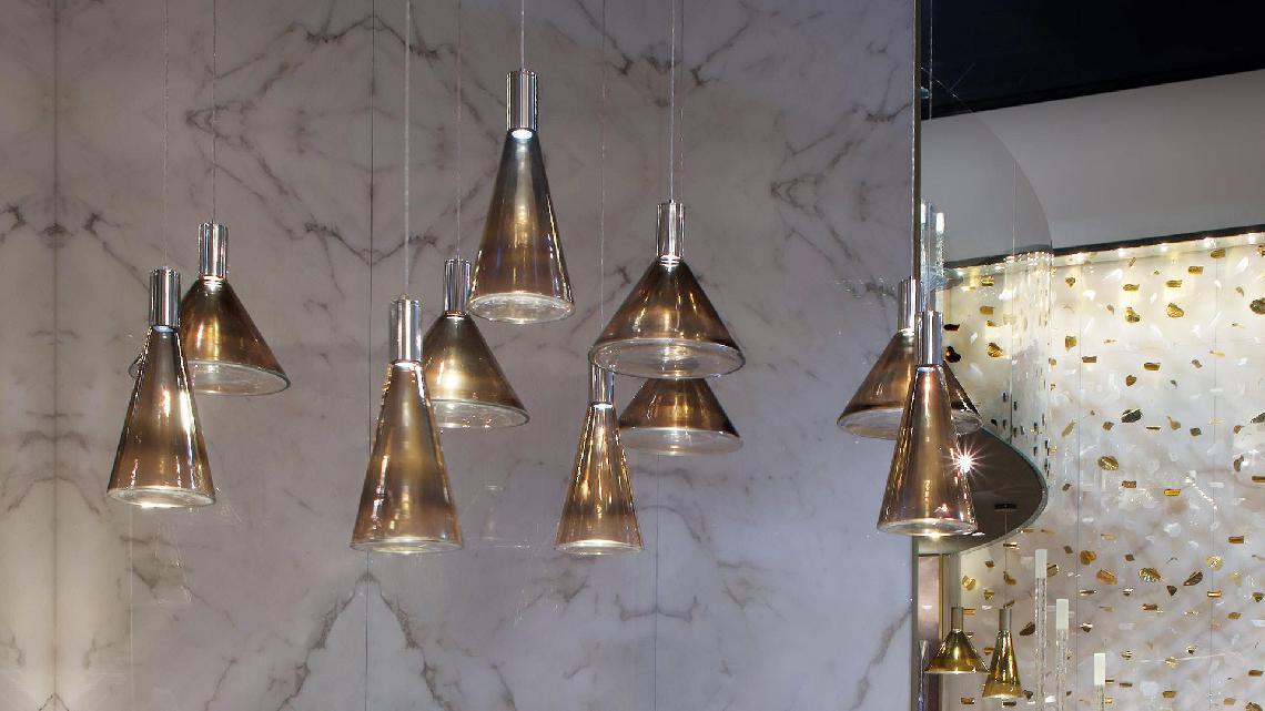 The Accademia collection, born with the tables, is enriched with pendant and table lamps, presented here in the copper finish.