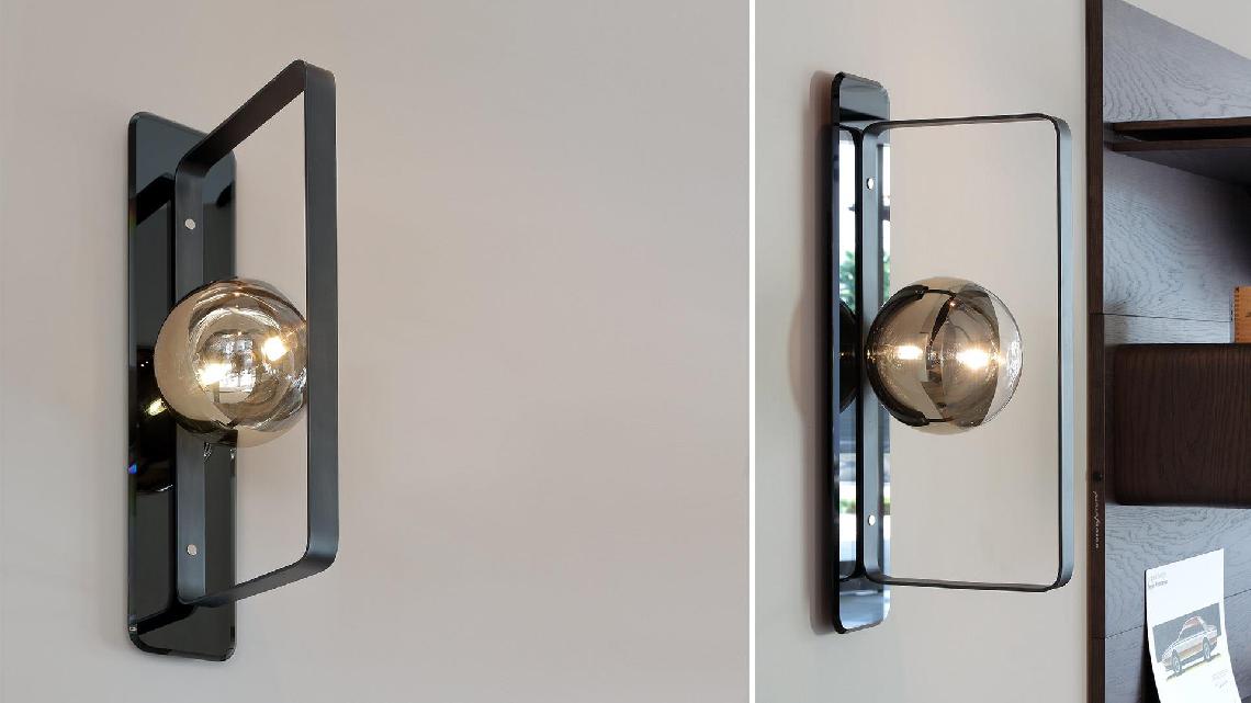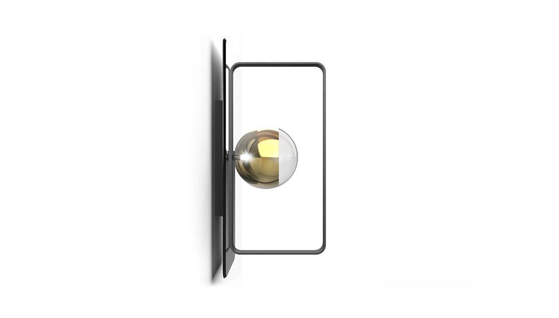 Wall lamp with metal structure in satin brass finish and support in bronze mirror or in satin dark titanium finish and support in smoked mirror. Sphere in borosilicate glass with 'light filter' finish in bronze, silver or gold with LED.