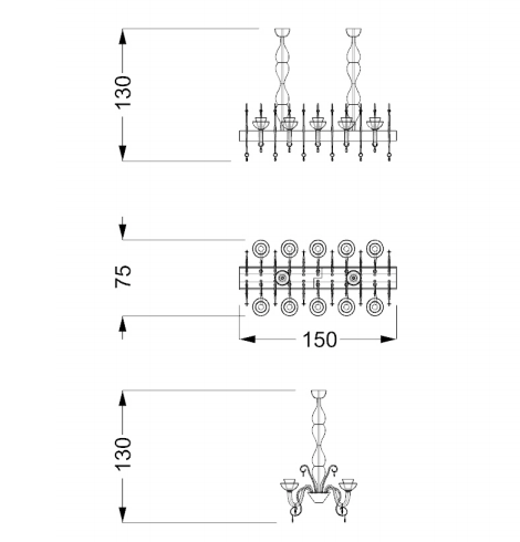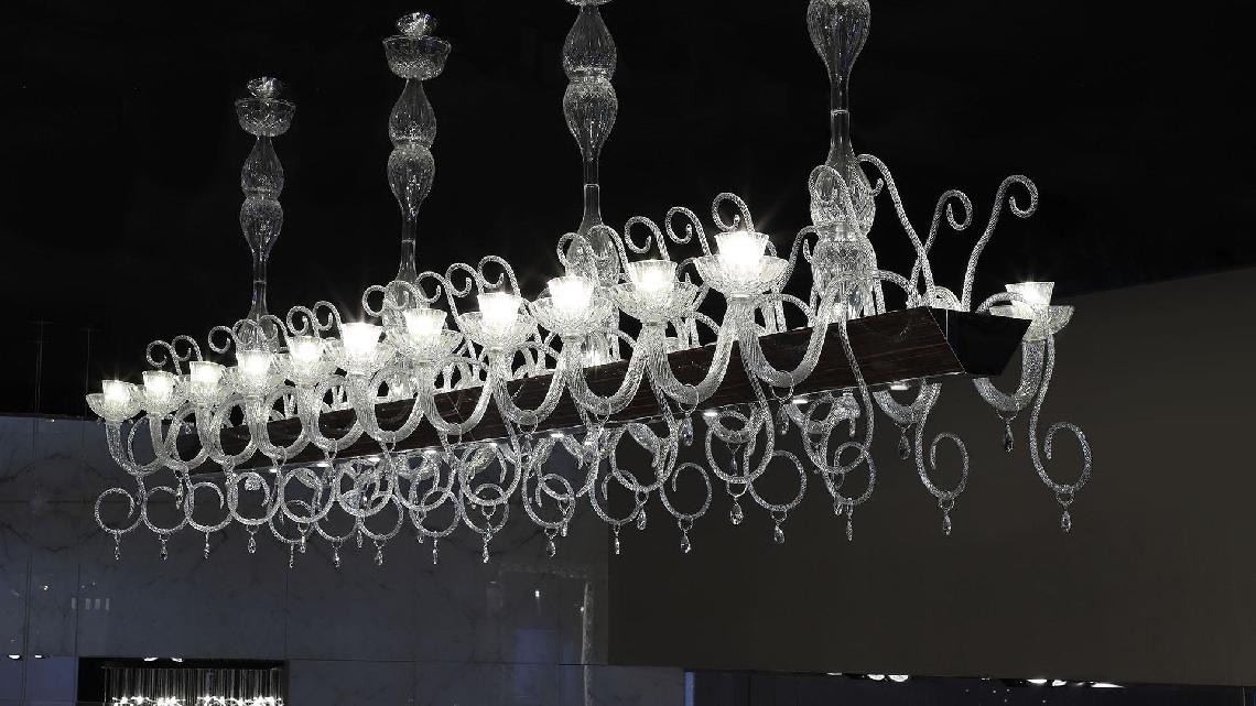 Modular chandelier composed by elements in engraved crystal and arms and pastorals in transparent Murano glass. Metal support covered in smoked mirror glass with Diamante engravings. Available in rectangular shape with 10 lights to be extend thanks to a connecting element with 2 lights or in round shape with 8 lights. Lighting system with Led bulbs
