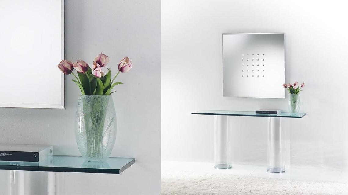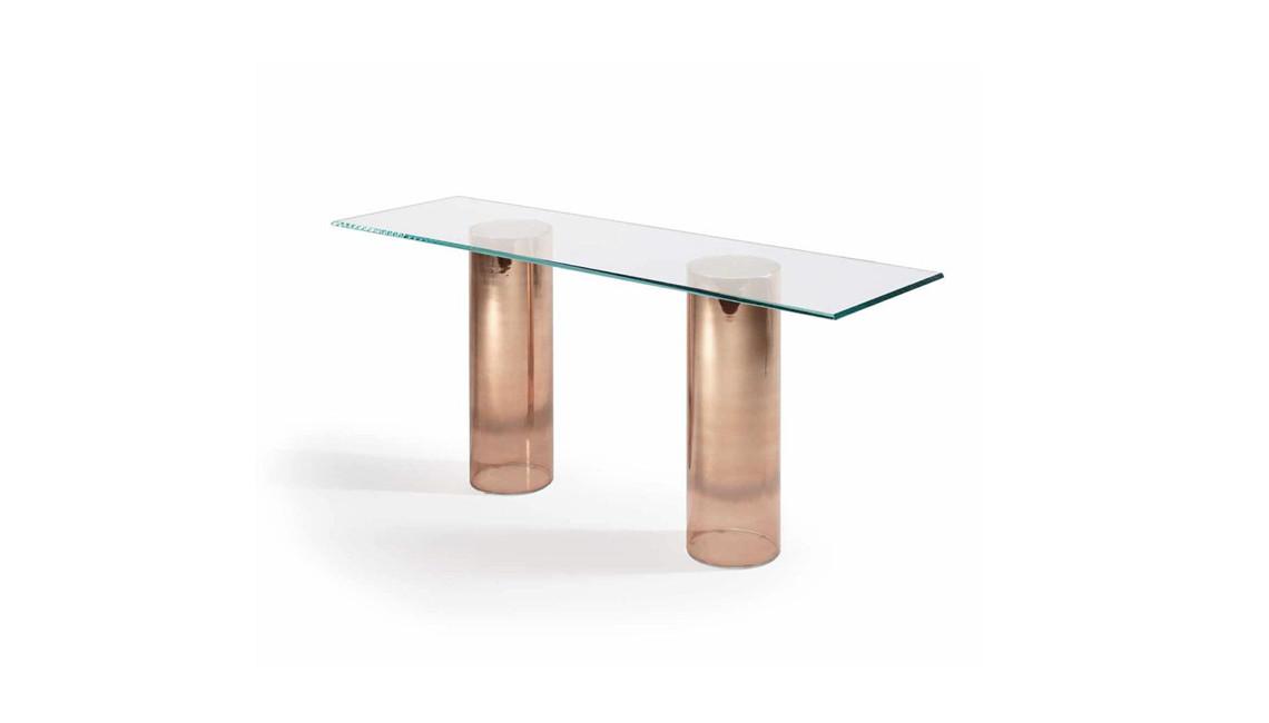 Console composed by 3 cylinders in borosilicate glass with shaded sputtering finish in Bronze, Silver and Copper .Glass top 12 mm thick with polished edges or in Bevel-Marble glass 40 mm th.