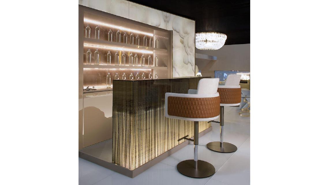 Sgabello con struttura in legno con seduta e schienale imbottiti a quote differenziate.
