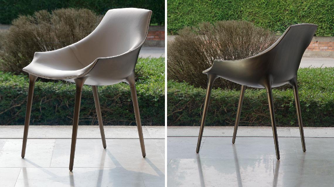 Chair with black or white polypropylene structure with padded seat upholstered in leather. Structure and legs also available in satin brass, dark brass, titanium or dark titanium finishes. Optional also with Emerald quilting on the leather cover
