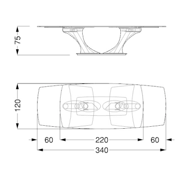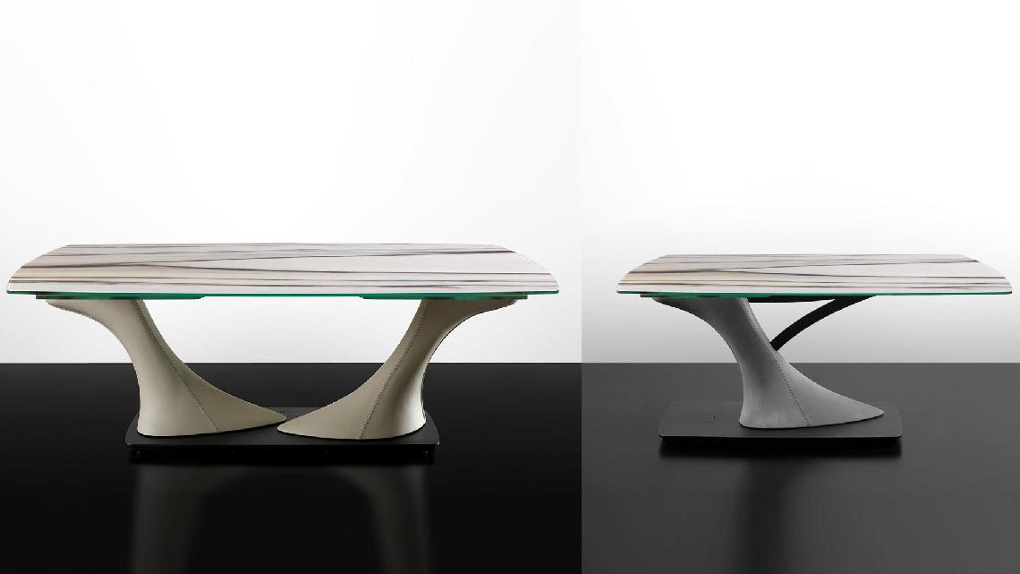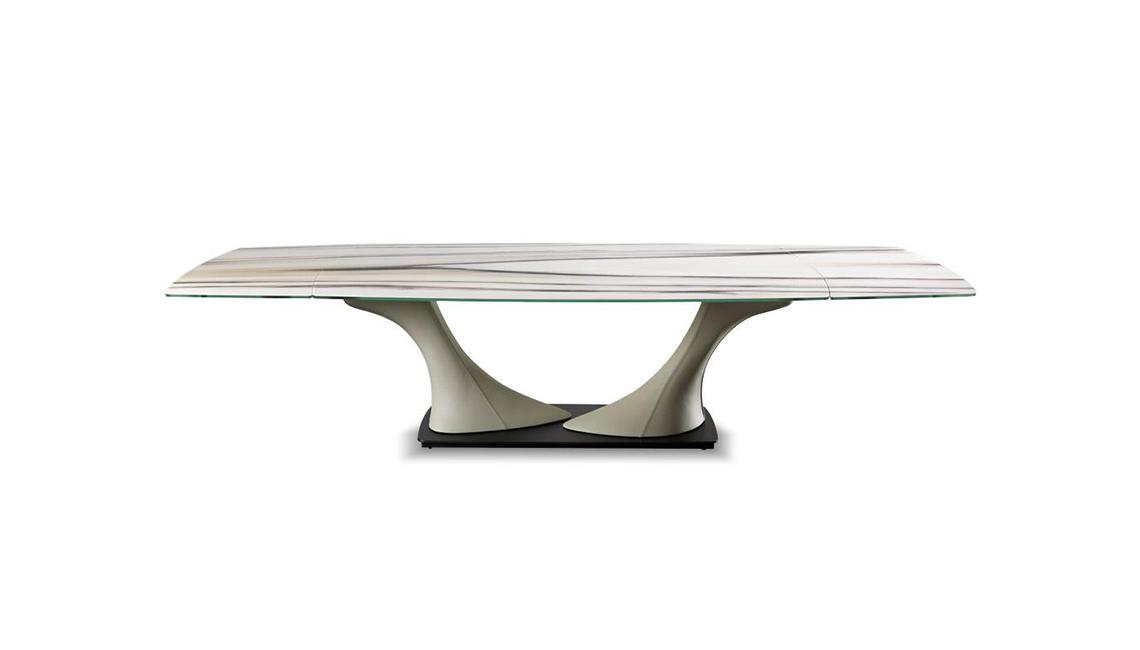 Extendable dining table with battery-powered electric mechanism with remote controle. Available with 1 extension and single base or with double base with 2 extensions. Legs covered with leather on a metal plinth painted in the satin brass or titanium finishes. Top in 15mm thick Marble glass.