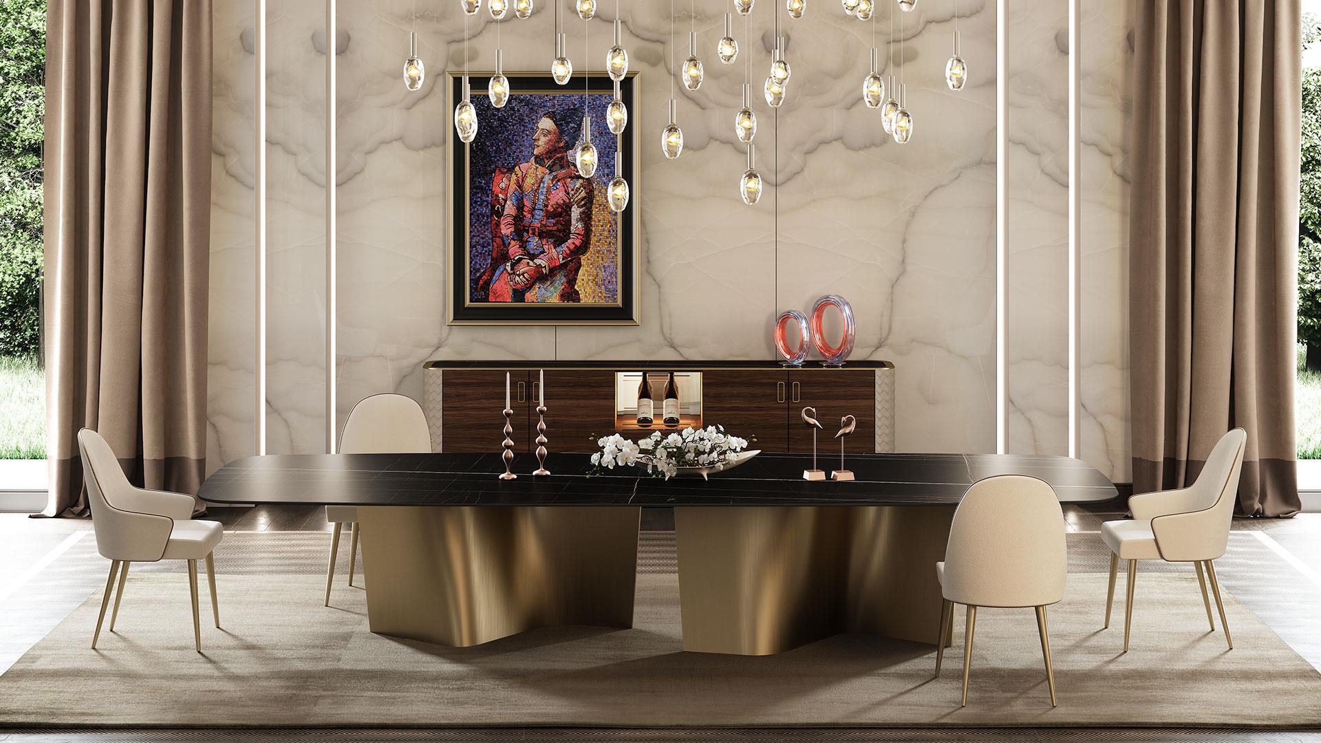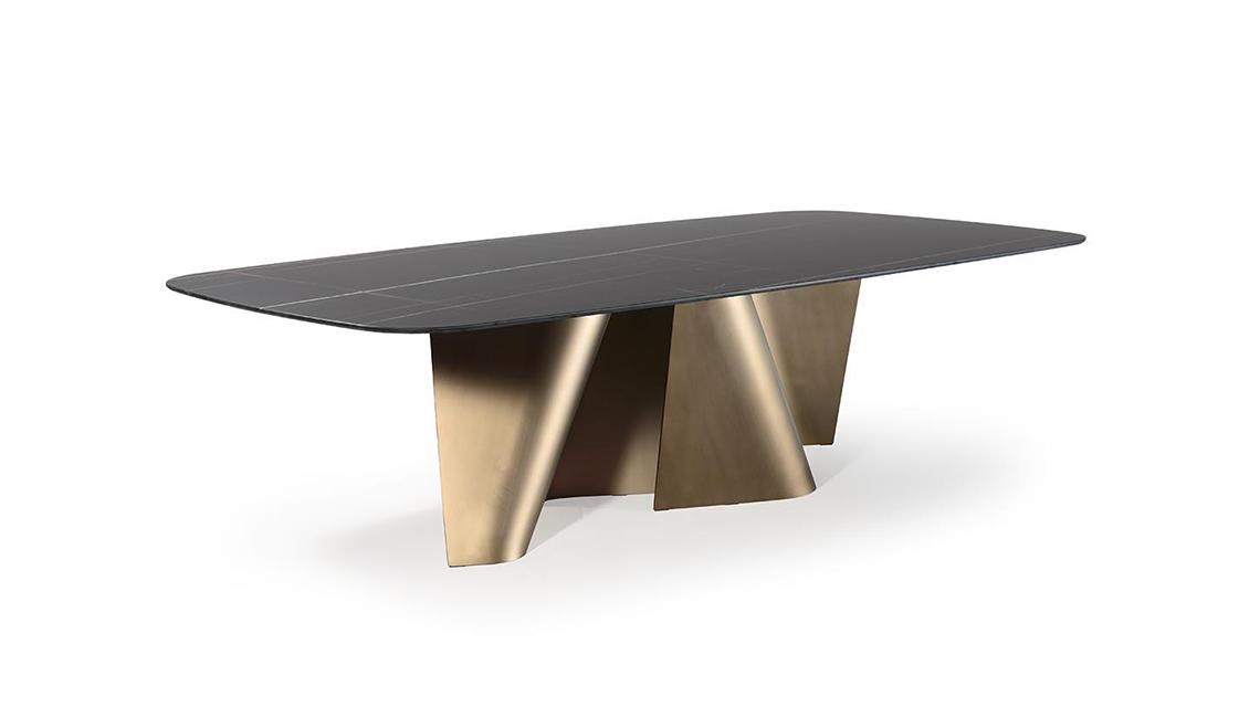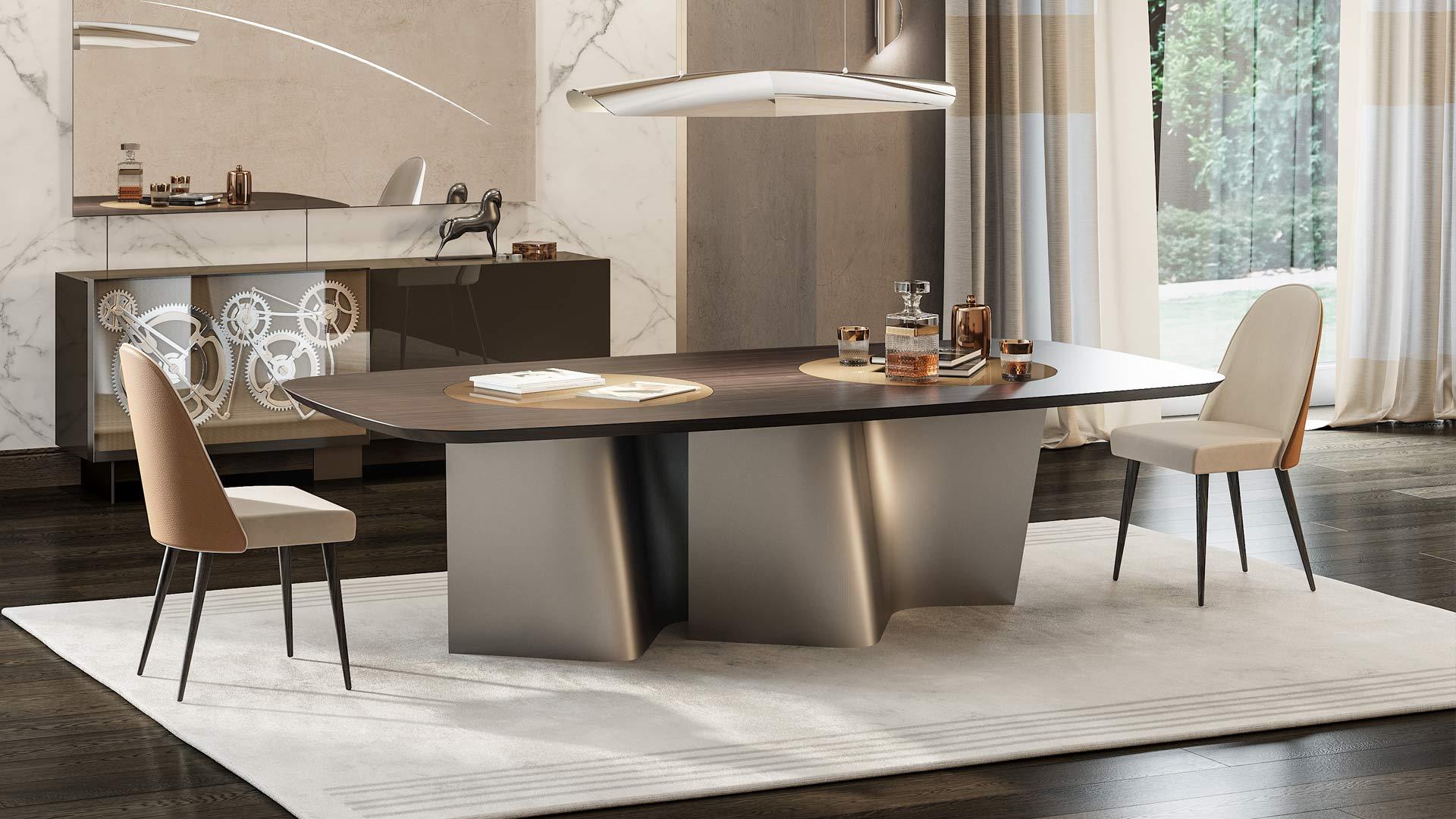 Dining table with bases in curved extra clear glass 15mm thick with Bronze, brass, dark brass and titanium finish