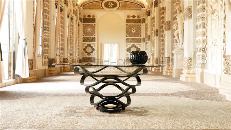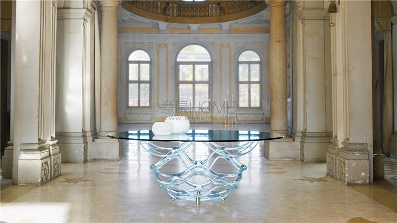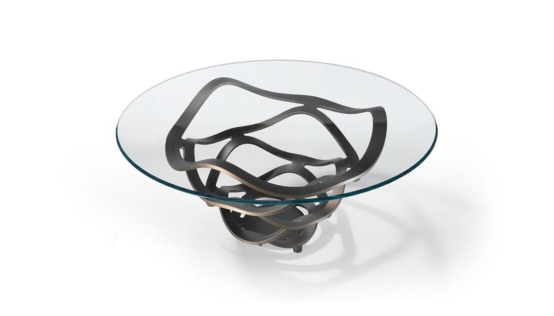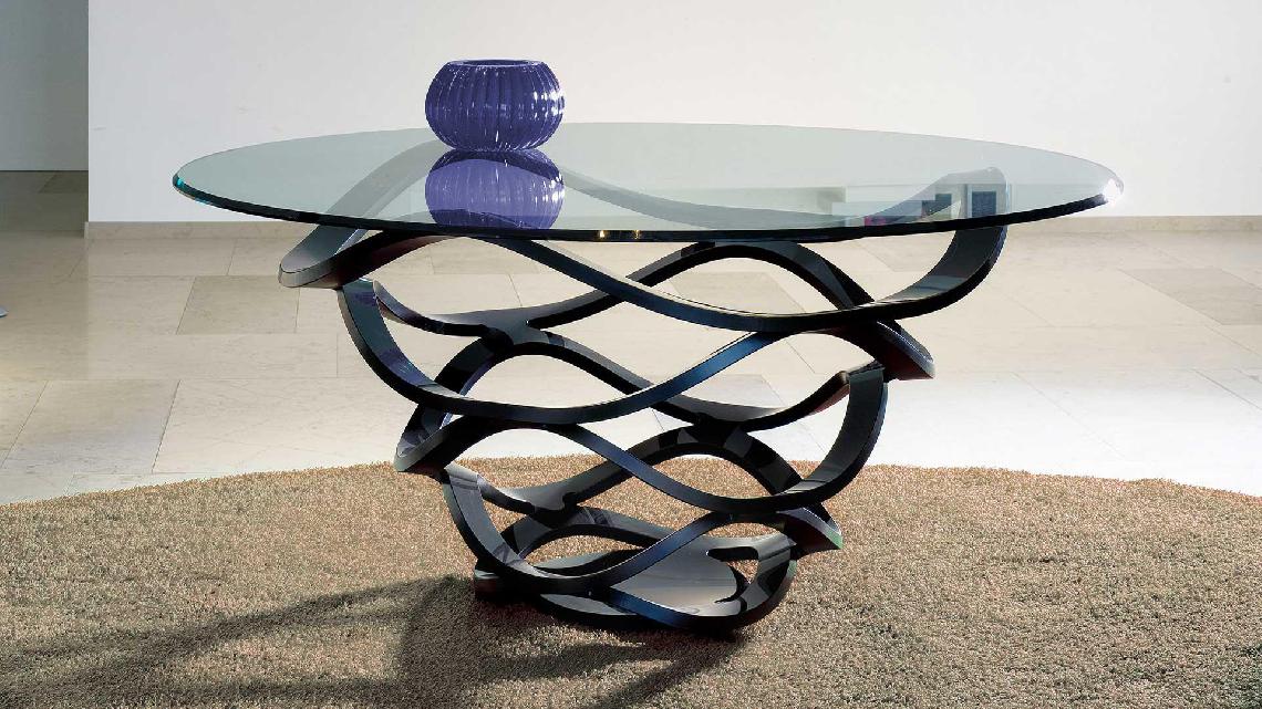 Dining table with round or oval base in curved glass 24mm thick transparent or black lacquered. Also available in extra clear 19mm thick glass. Glass top 15mm thick with 45° bevel.