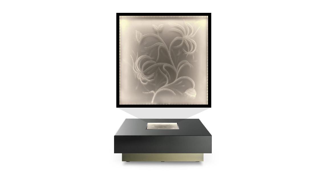 Coffee table with wooden plinth in satin brass finish. Wooden top in shiny lacquered finish covered in lacquered glass or in shiny ebony with a tile in engraved glass in the centre.