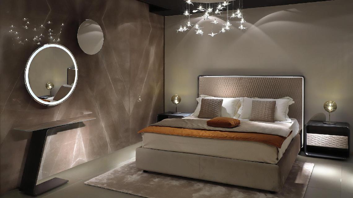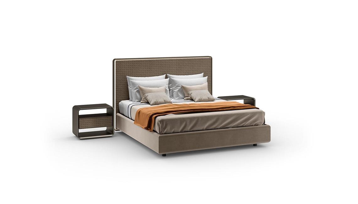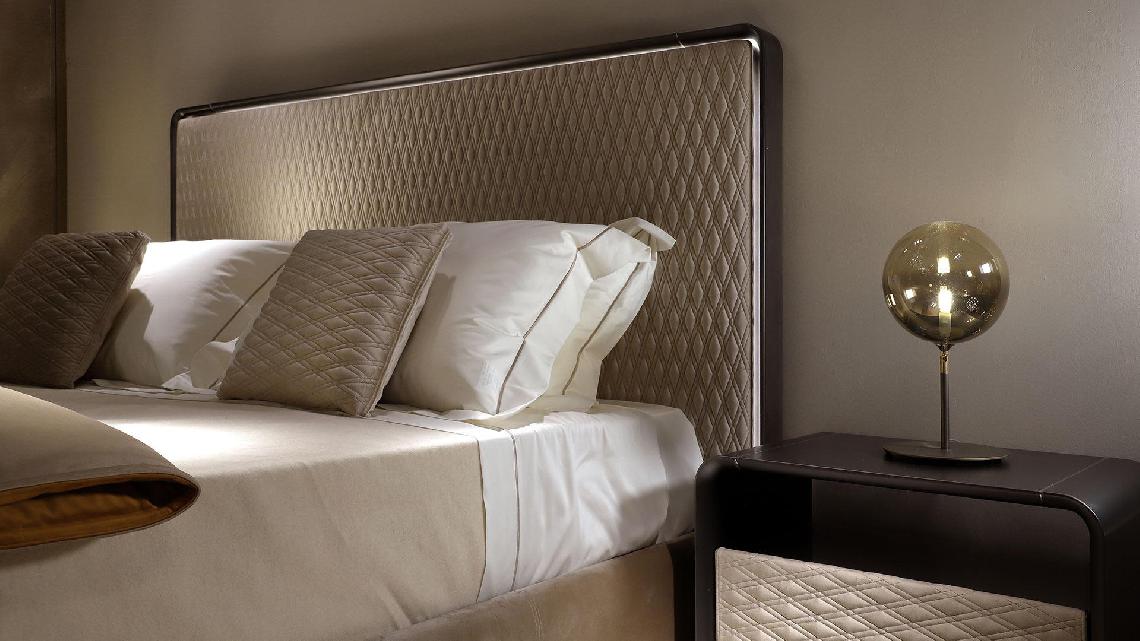 Letto con struttura in legno. Testiera imbottita rivestita in pelle o tessuto con trapuntatura* con cornice sagomata in legno finitura Bronze, Ottone, Ottone dark, Titanium con illuminazione LED.